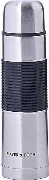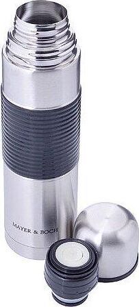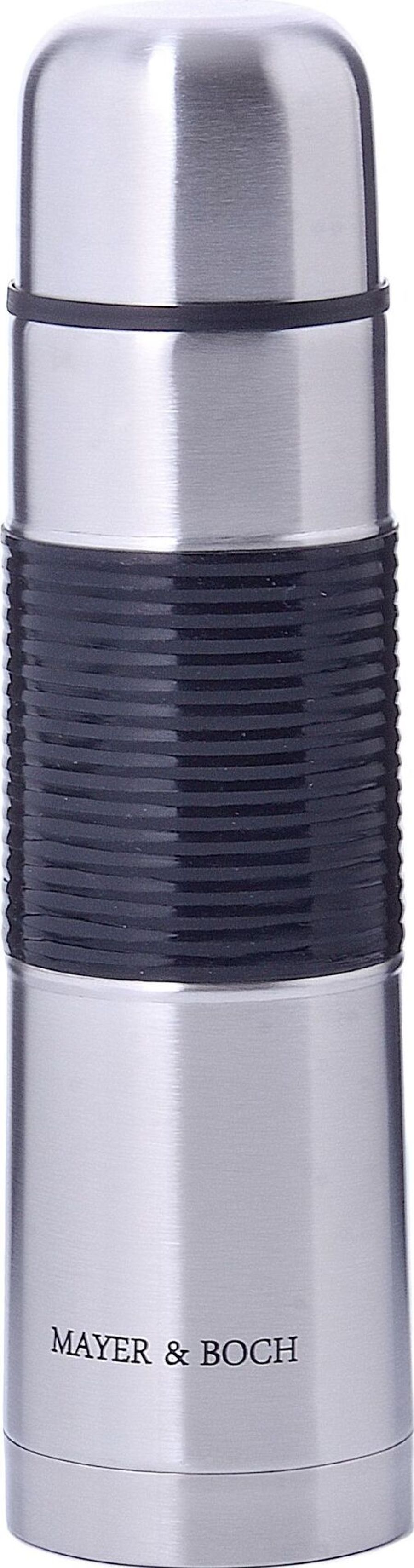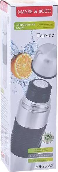 Термос МВ (х24). Корпус: нержавеющая сталь. Внутренняя колба: нержавеющая сталь. Крышка: полипропилен. Внешняя вставка: силикон. Цвет: серебристый, черный. Диаметр горлышка: 4,5 см. Объем: 750 мл. Размер упаковки: 8,5 х 8,5 х 30 см. Вес: 490 г. Страна-изготовитель: Китай. Упаковка: коробка.