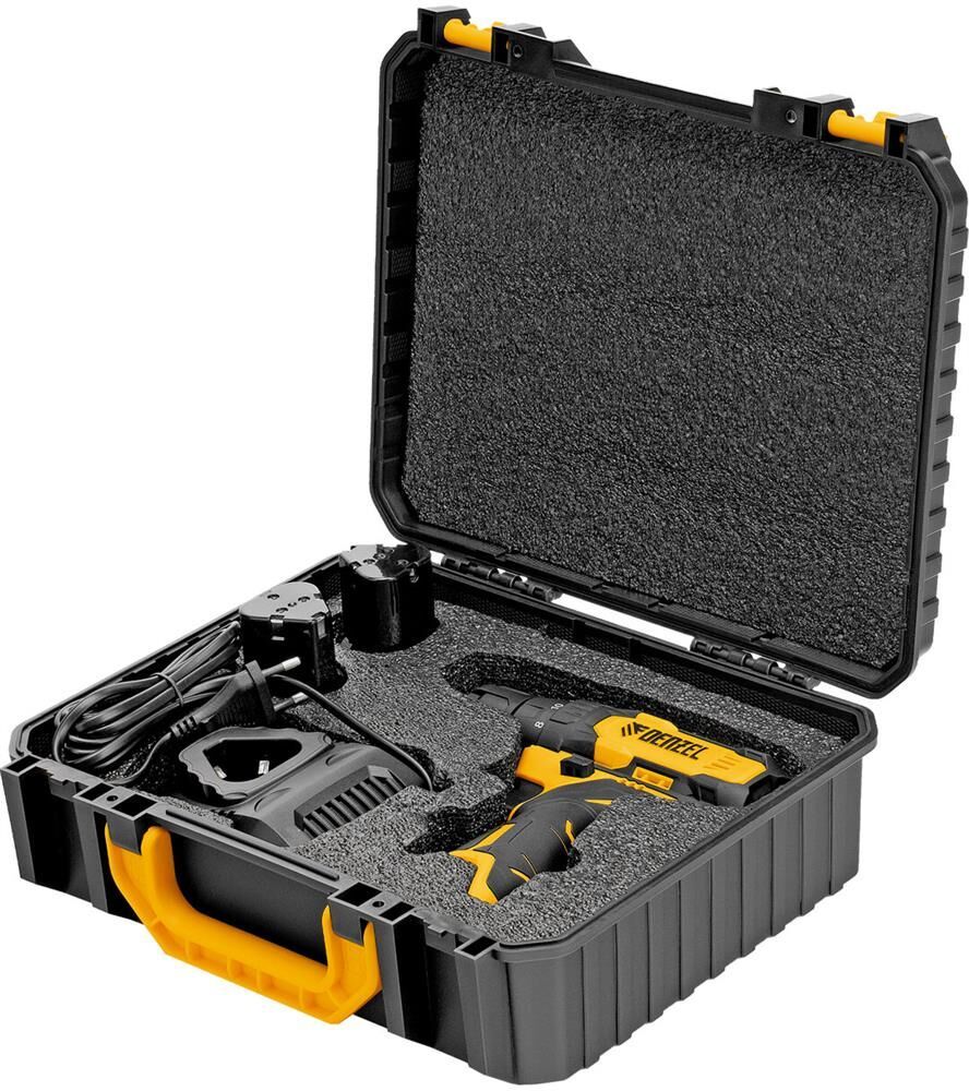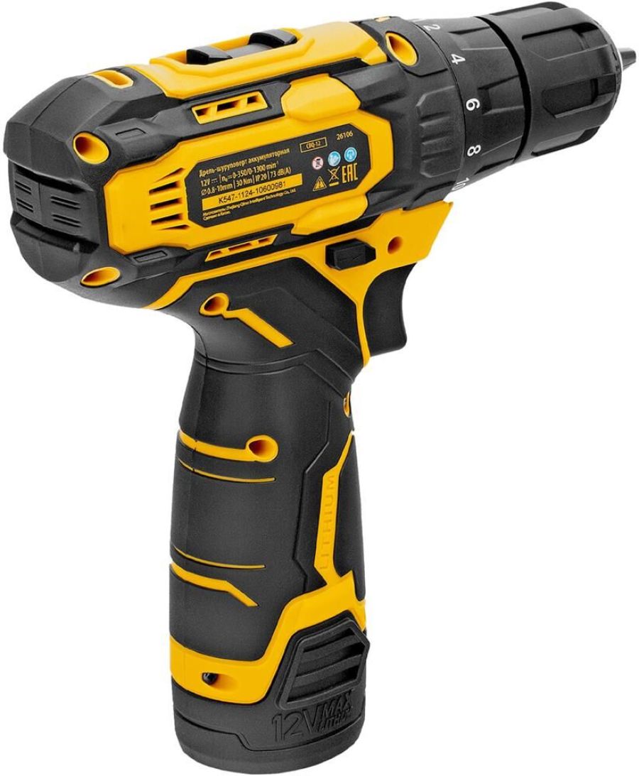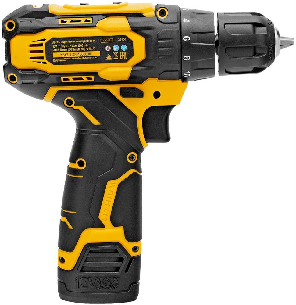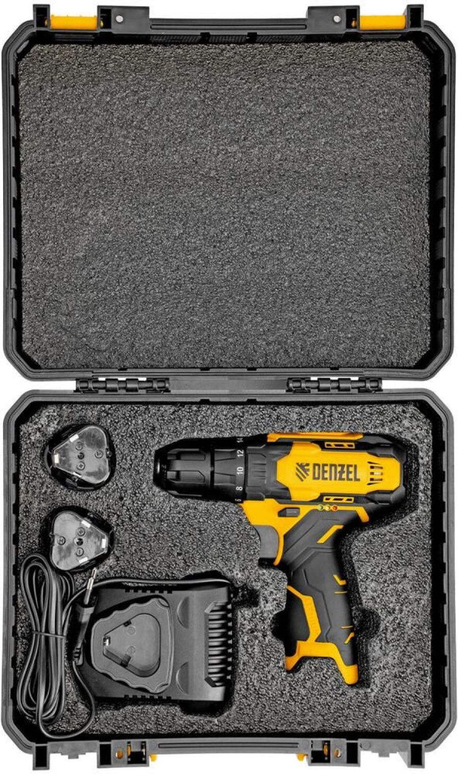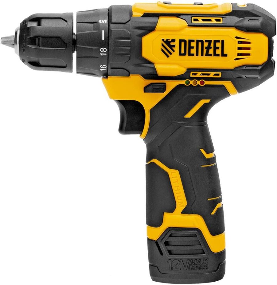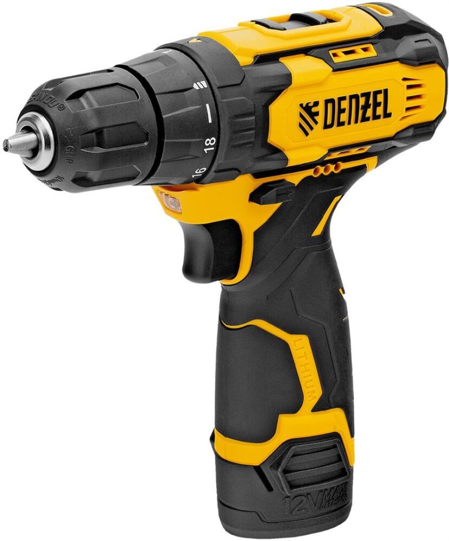 Аккумуляторная дрель-шуруповерт Denzel CDQ-12 26106 предназначена для работы с резьбовым крепежом и сверления отверстий в древесине, металле, пластике и других материалах. Максимальный диаметр отверстий в древесине составляет 20 мм, в металле — 10 мм. Инструмент работает от аккумулятора Li-Ion 12 В, развивает крутящий момент до 30 Н·м, что позволяет эффективно справляться с поставленными задачами. Преимущества Быстрая замена оснастки — блокировка шпинделя упрощает установку биты или сверла. Плавная регулировка оборотов — частота вращения шпинделя меняется в диапазоне 0-350 об/мин для завинчивания крепежа и 0-1300 об/мин для сверления. 18+1 ступень регулировки крутящего момента — можно выбрать наиболее подходящий режим в зависимости от типа крепежа и плотности материала. Тормоз свободного выбега — вращение шпинделя мгновенно прекращается после выключения, что позволяет избежать перетяжки крепежа. Удобная работа даже при плохом освещении — подсветка рабочей зоны включается одновременно с запуском двигателя. Функция реверса — удобно извлекать сверло или саморез, а также работать с крепежом с левой резьбой. Индикация заряда — можно быстро определить, когда пора подзарядить аккумулятор. Бесперебойная работа — в комплект поставки входят 2 аккумулятора, что позволяет не прерывать работу на время зарядки. Блокировка случайного включения — если переключатель вращения установлен в среднее положение, двигатель не запустится. Расширенная комплектация — дрель-шуруповерт поставляется с дв…
