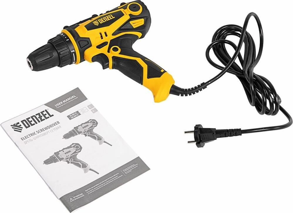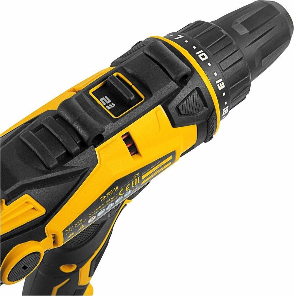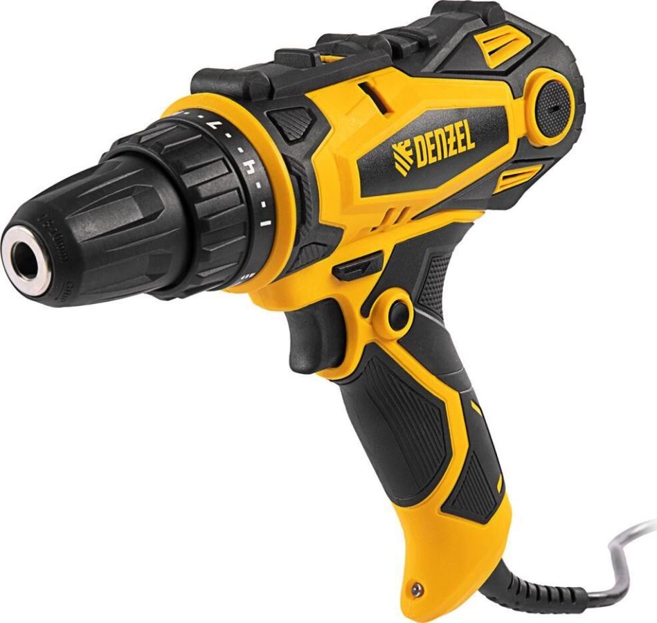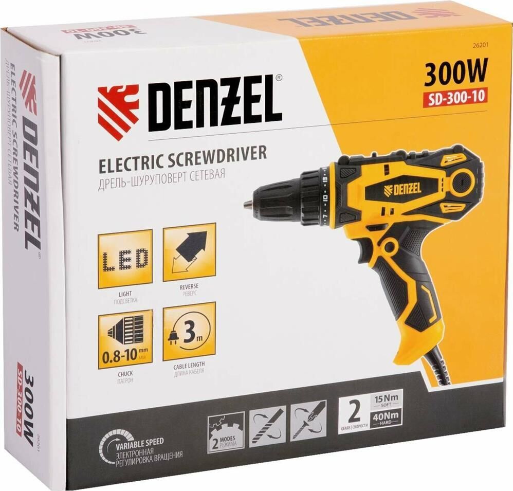 Сетевая дрель-шуруповерт Denzel SD-300-10 26201 предназначена для монтажа и демонтажа резьбовых соединений, а также сверления отверстий в металле (до 10 мм), древесине (до 20 мм) и других материалах. Крутящий момент 40 Нм позволяет эффективно решать поставленные задачи. Дрель-шуруповерт будет полезна на строительной площадке и в быту.ПреимуществаРегулировка крутящего момента есть возможность подобрать оптимальное усилие затяжки под тип крепежа.Двухскоростной редуктор скорость настраивается в диапазоне 0-400 или 0-1600 об/мин для работы с резьбовым крепежом и сверления отверстий.Электронная регулировка скорости интенсивность вращения шпинделя легко меняется в зависимости от степени нажатия на клавишу пуска.Реверс можно быстро переходить от закручивания к демонтажу резьбовых соединений.Легкая смена оснастки быстрозажимной одномуфтовый патрон позволяет снимать и устанавливать биты и сверла одной рукой.