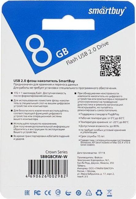 В дизайне Crown - простота и стиль, емкость 8GB, интерфейсUSB 2.0, отверстие для шнурка позволяет прикрепить накопитель к вашему телефону или связке ключей, чтобы он всегда был под рукой, дизайн устройства предусмотрен таким образом, что колпачок можно прикрепить сзади корпуса.