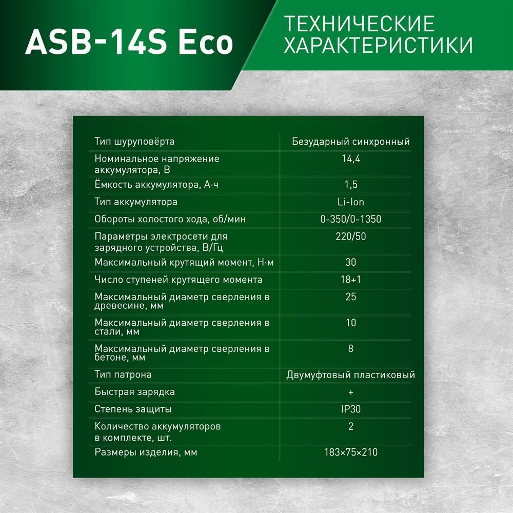 Тип шуруповёрта безударный синхронный Номинальное напряжение аккумулятора, В 14,4 Ёмкость аккумулятора, А·ч 1,5 Тип аккумулятора Li-Ion Обороты холостого хода, об/мин 0-350/0-1350 Параметры электросети для зарядного устройства, В/Гц 220/50 Максимальный крутящий момент, Н·м 30 Число ступеней крутящего момента 18+1 Максимальный диаметр сверления в древесине, мм 25 Максимальный диаметр сверления в стали, мм 10 Максимальный диаметр сверления в бетоне, мм 8 Тип патрона двумуфтовый пластиковый патрон Степень защиты IP30 Количество аккумуляторов в комплекте, шт. 2 Размеры изделия, мм 183×75×210