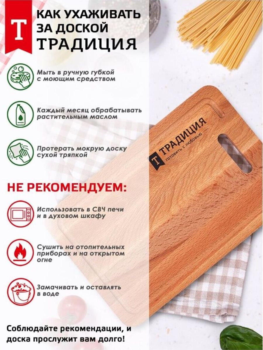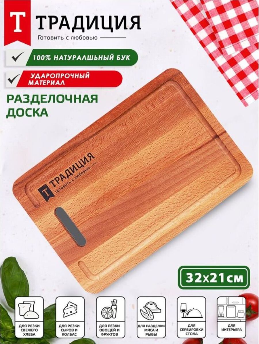 Доска разделочная 32x21x1,6см ТМ Традиция, изготовлена из натуральной древесины. Бук 100%. Не подходит для посудомоечной машины.