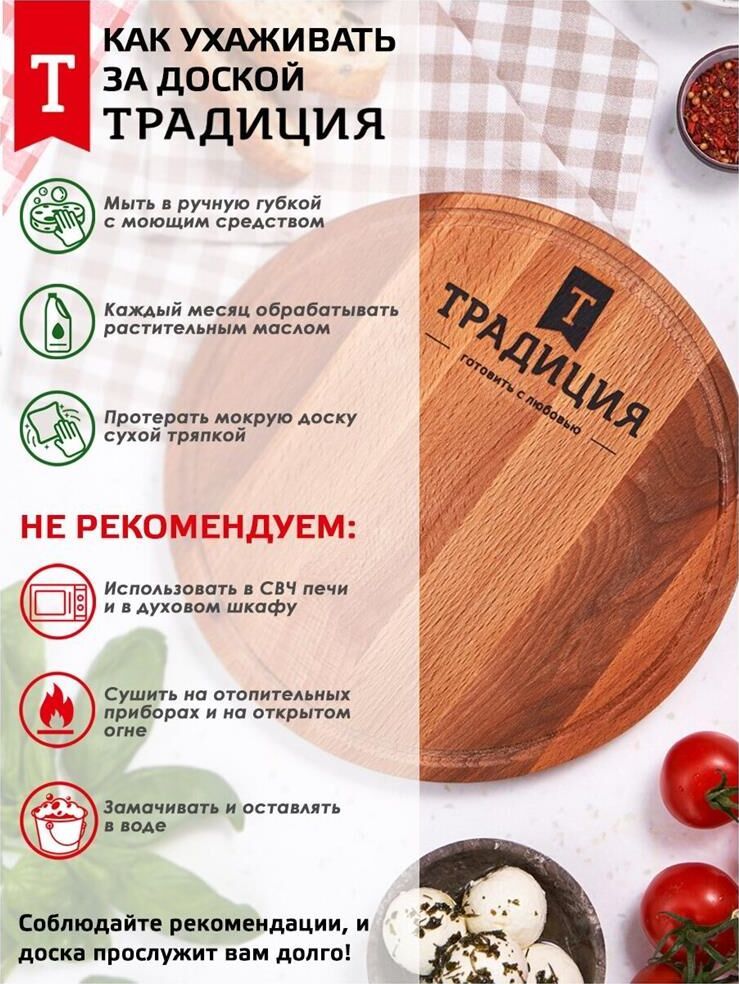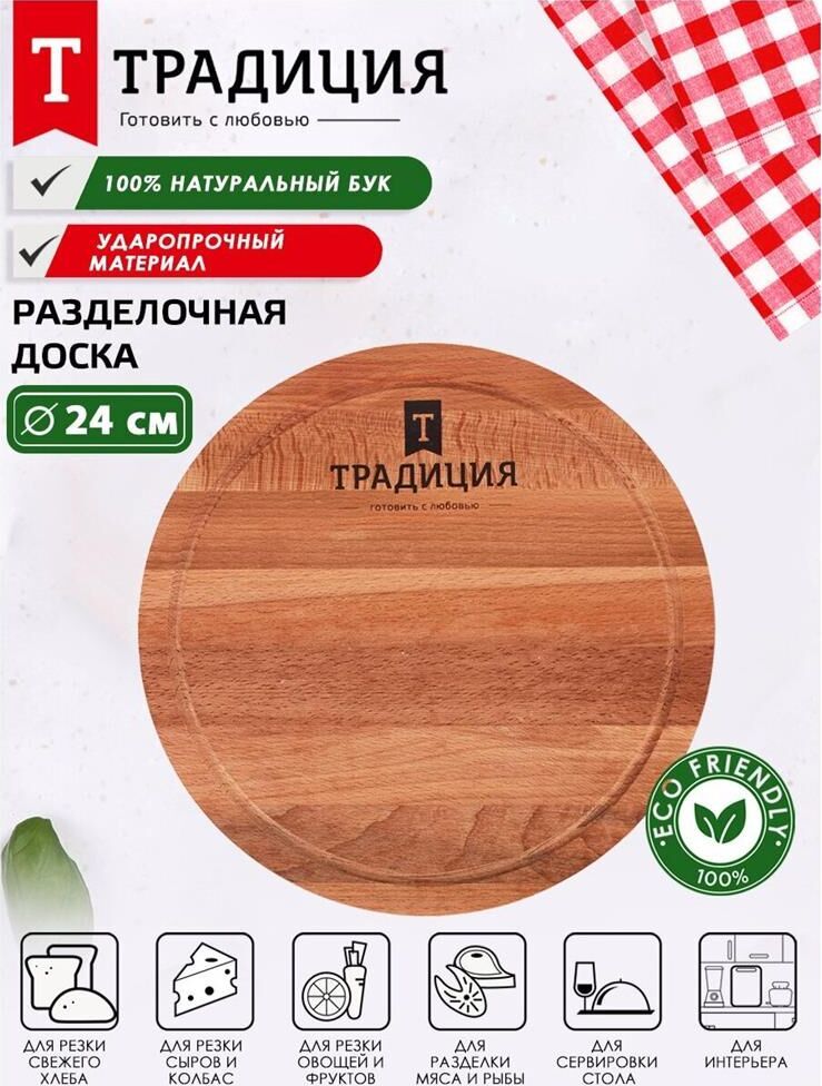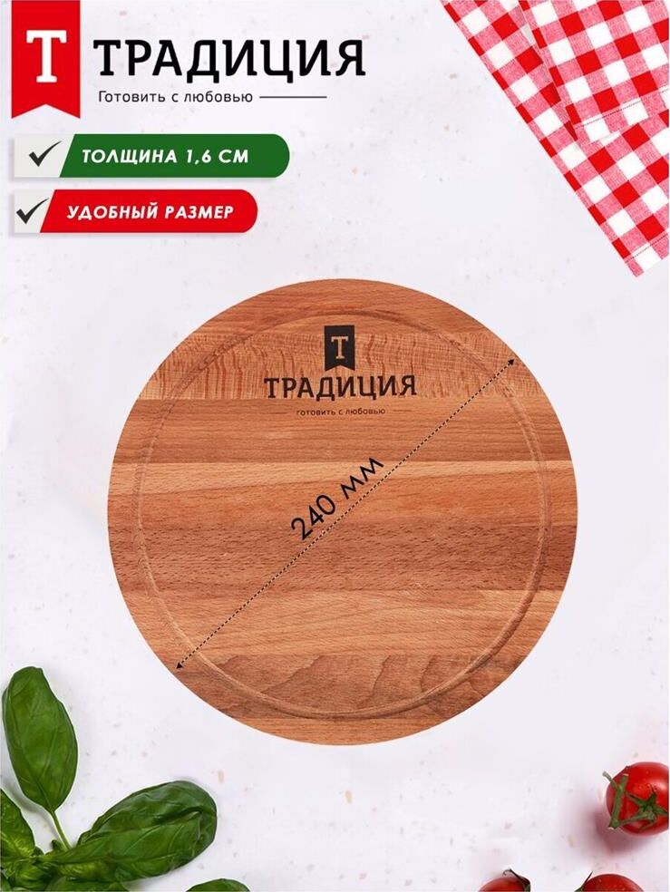 Доска разделочная 24см круглая ТМ Традиция, изготовлена из натуральной древесины. Бук 100%. Не подходит для посудомоечной машины.