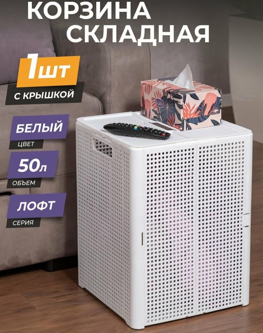 Корзина складная "Лофт" с крышкой 50л (белый)