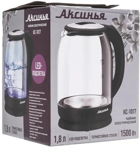 Параметры Объем 1,8 л Номинальная потребляемая мощность 1500 Вт Описание Чайник электрический предназначен для нагрева воды в бытовых и аналогичных условиях Корпус из высококачественного термостойкого стекла Вращение корпуса на 360° Закрытый нагревательный элемент из нержавеющей стали Шкала уровня воды Внутренняя LED-подсветка Отсек для хранения шнура питания Автоматическое отключение при закипании Блокировка включения без воды Цвет: черный Упаковка: цветная коробка
