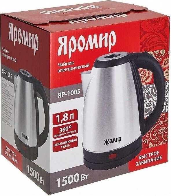 Параметры Объем 1,8 л Номинальная мощность 1500 Вт Описание Корпус из нержавеющей стали Закрытый нагревательный элемент Матовая полировка Вращение корпуса на 360° Световой индикатор работы Отсек для хранения электрошнура Цвет крышки и ручки: черный Автоматическое отключение при закипании Блокировка включения без воды Упаковка: цветная коробка