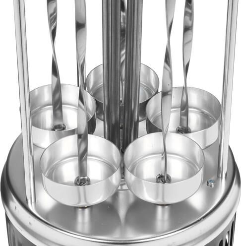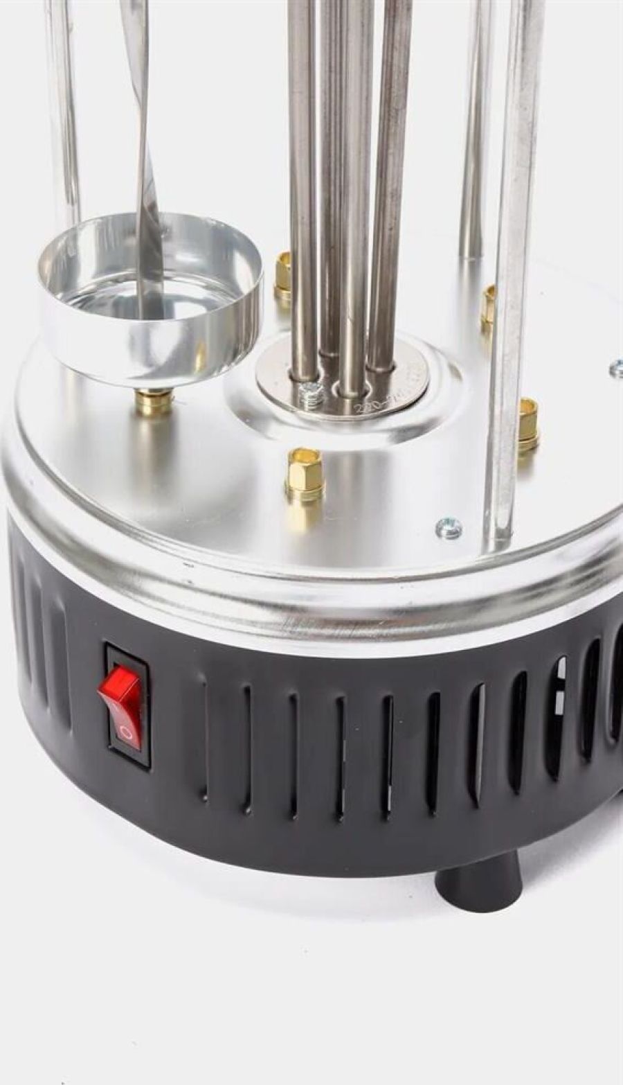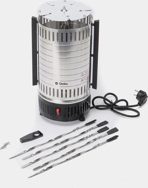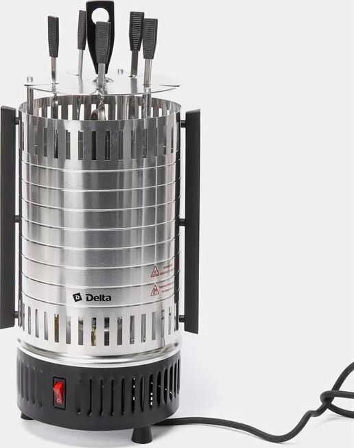 DELTA" DL-6700 Параметры Номинальная потребляемая мощность 1000 Вт Максимальная температура нагрева 255°С Количество шампуров 5 штук Длина шампура 33 см Максимальная загрузка 3 кг Частота вращения шампуров 2,5 об/мин Описание Электрошашлычница предназначена для использования в бытовых и аналогичных условиях и представляет собой устройство для приготовления гриля, шашлыка и других блюд из мяса, рыбы, овощей и др. Тип прибора - электрошашлычница с вертикальным расположением шампуров Вертикальный ТЭН из нержавеющей стали Тепловой экран из полированного алюминия с бакелитовыми ненагревающимися ручками 5 шампуров из нержавеющей стали с бакелитовыми ненагревающимися ручками 5 чашечек для сбора жира, предотвращающих загрязнение шашлычницы Кнопка включения/выключения на корпусе прибора со световым индикатором работы Функция автоматического вращения шампуров для равномерного и быстрого приготовления продуктов