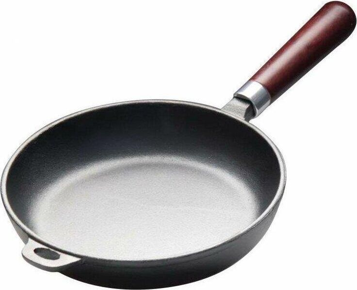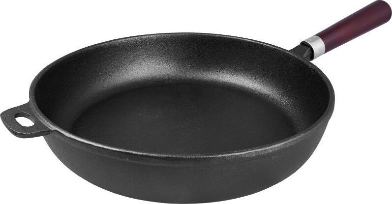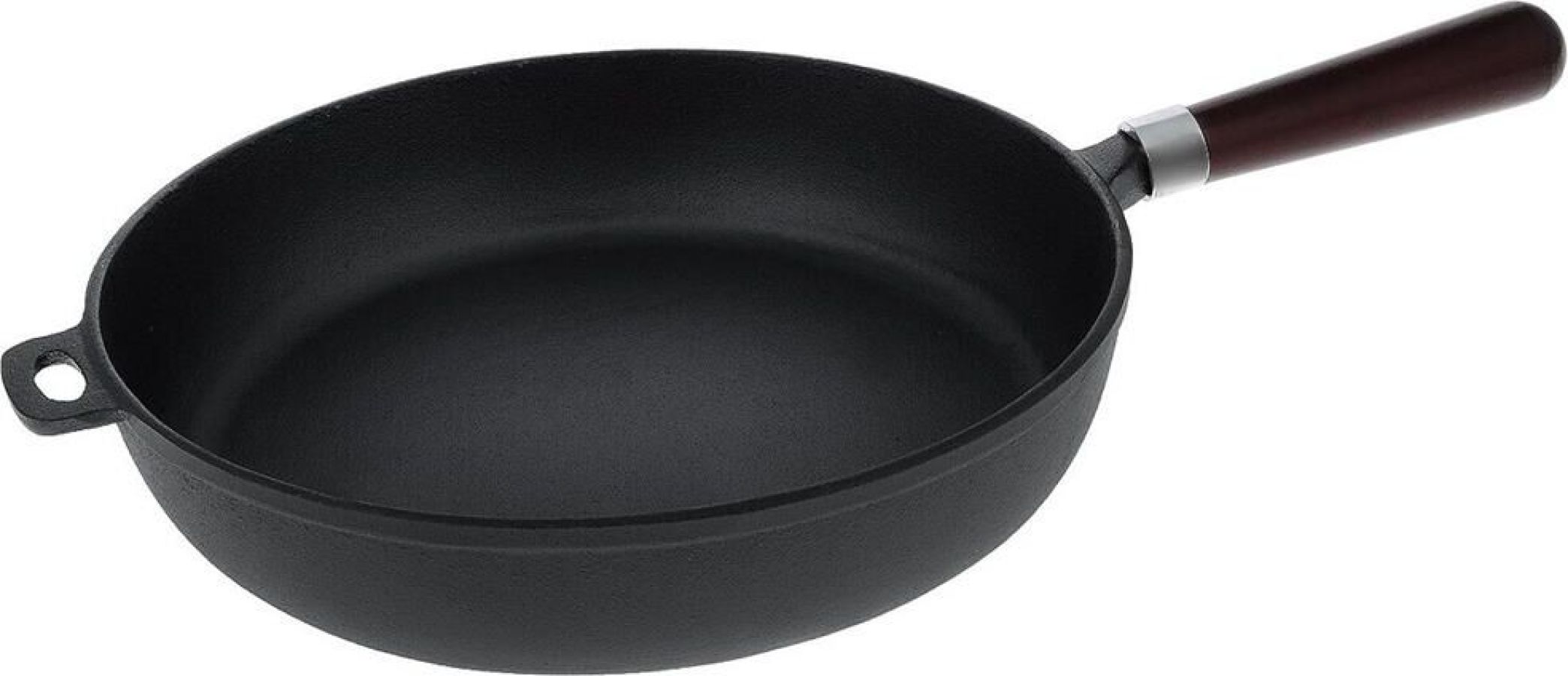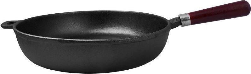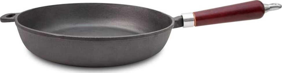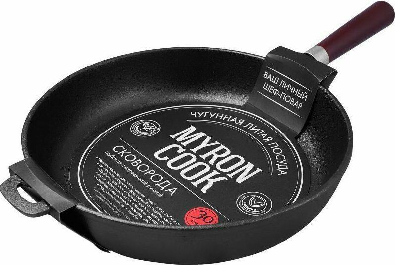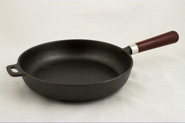 Сковорода чугунная глубокая 30см деревянная ручка, идеальная сковорода для приготовления любых блюд. Подходит для любых типов плит: газовых, индукционных, электрических, стеклокерамических. Нельзя мыть в посудомоечной машине. Преимущество чугуна - равномерный нагрев, что предотвращает пригорание пищи. Готовое блюдо достаточно долго будет сохранять свое тепло, избавив вас от необходимости дополнительного подогрева. Эргономичная рукоятка дополнена специальным отверстием для подвеса, что обеспечивает комфорт использования изделия. Небольшие углубления в стенках сковороды позволяют удобно слить из нее содержимое, не пачкая при этом поверхность стола. Во время мытья не рекомендуется применять чистящие средства с абразивными веществами, а также жесткие губки. Естественное антипригарное покрытие. Диаметр верха 30 см Толщина дна 4 мм Высота стенок 6.5 см Толщина стенок 3.9 мм