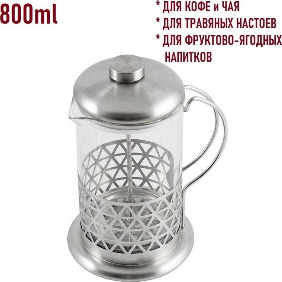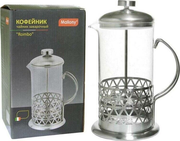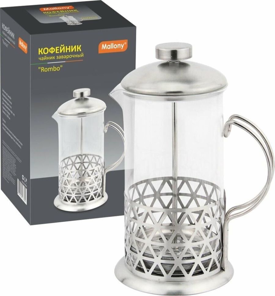 Кофе-пресс/чайник заварочный серия Rombo, объем 800 мл, тм MALLONY Предназначен для заваривания чая, кофе, прочих напитков. Коэффициент линейного расширения - 3,0. Корпус/фильтр/стержень из нержавеющей стали № 201, колба из жаропрочного боросиликатного стекла. Крышка - нерж сталь № 201/пластмасса. Толщина стекла - 2 мм Толщина нерж стали - 0,3 мм Можно мыть только стекл колбу в посудомоечной машине, остальные части не рекомендуется мыть в посудомоечной машине (можно мыть мягким моющим средством и теплой водой, хорошо просушивать). Упаковка: цветная картонная коробка.