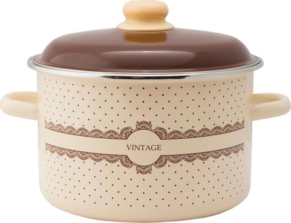 Кастрюля 5,5л цилиндрическая Vintage Материал эмалированная сталь. Толщина дна: 0.8 Толщина стенок: 0.8 Источник тепла: Все виды плит Крышка: эмалированная