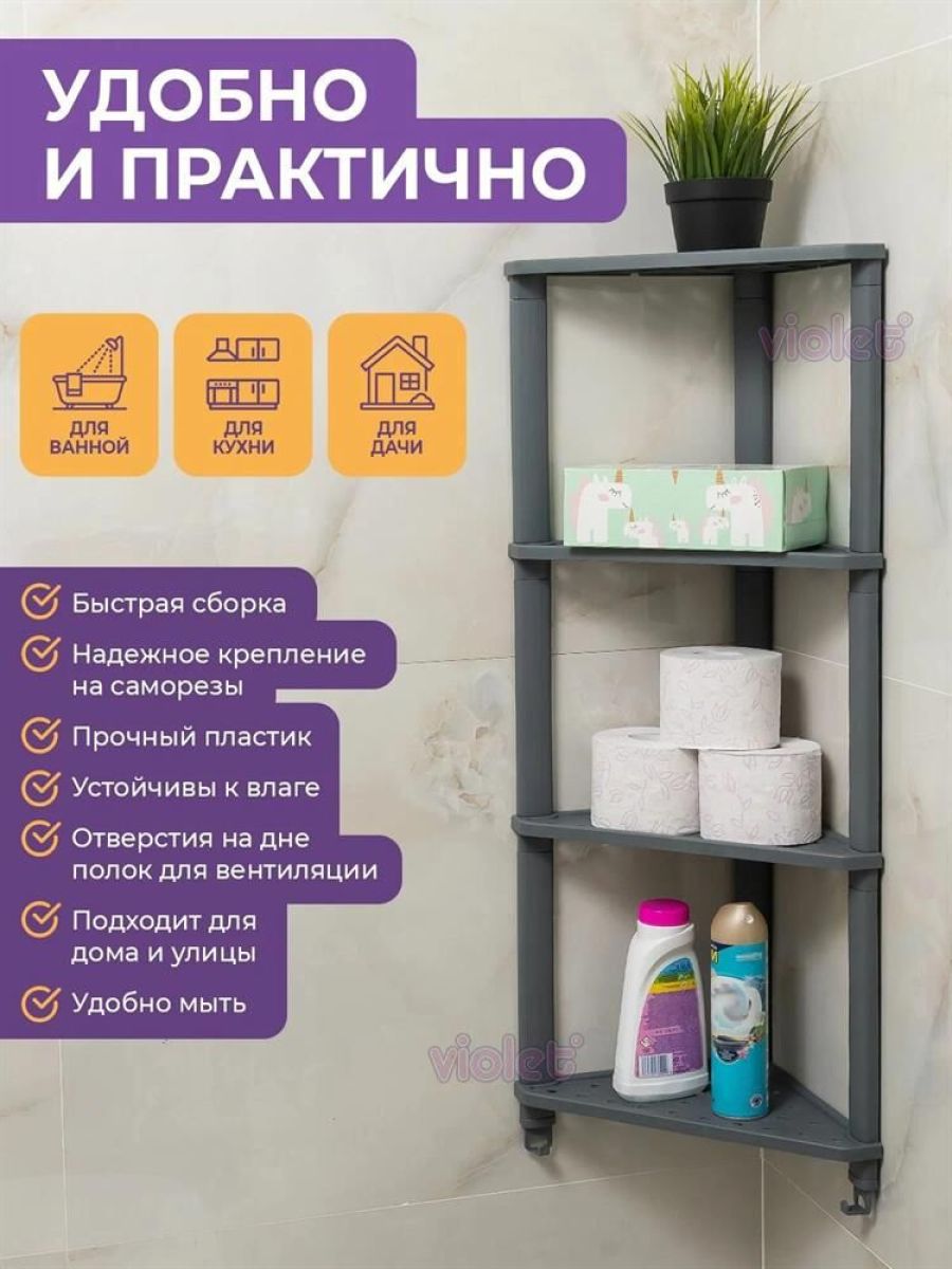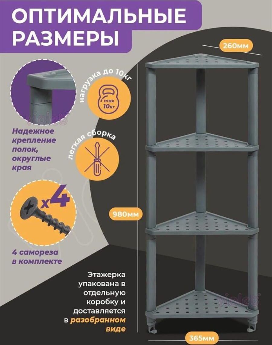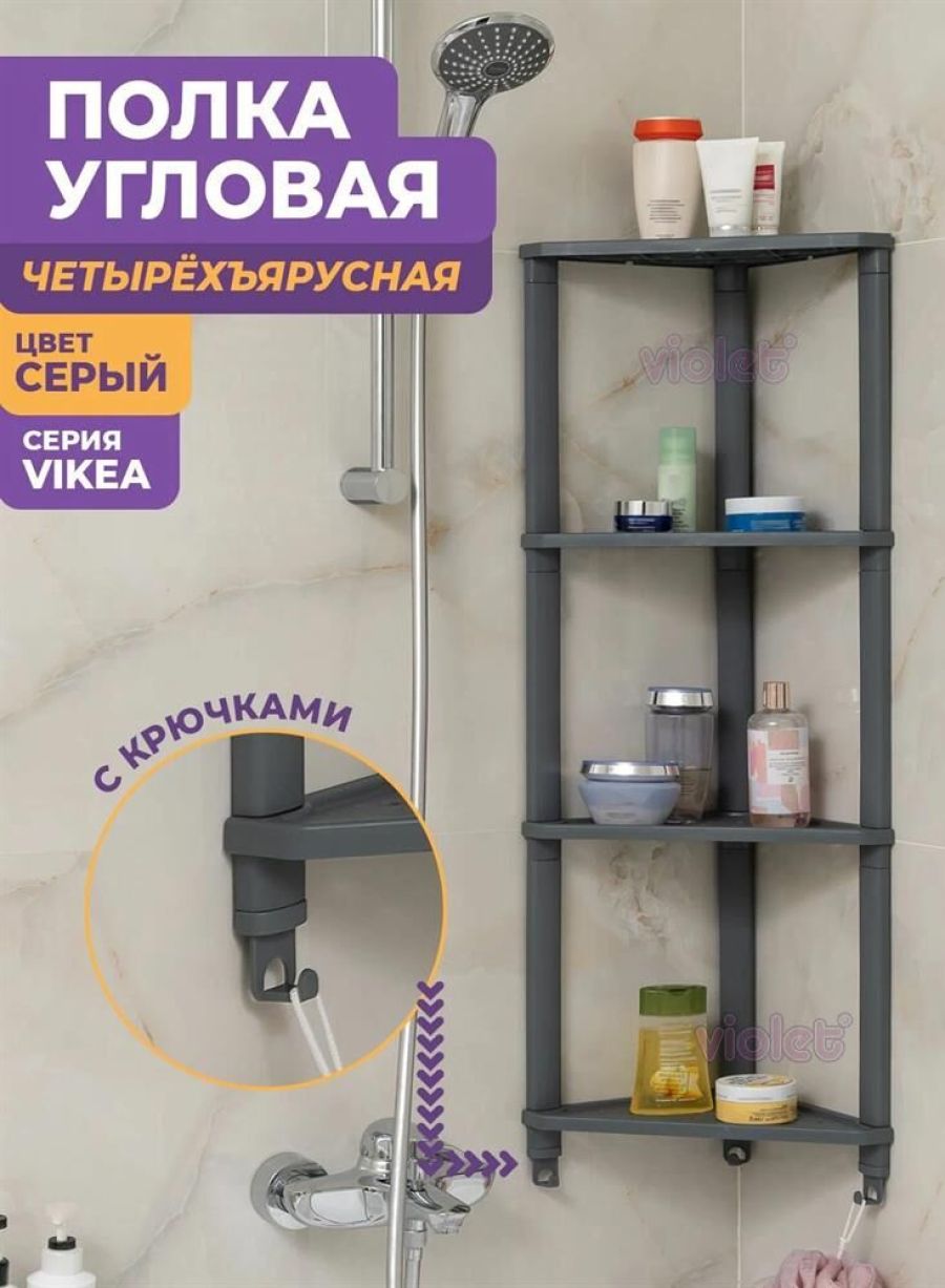 Полка VIKEA угловая подвесная 4-х ярусная (серый) Тип этажерка Установка навесная Количество уровней 4 Материал пластик Цвет серый Ширина 27 см Глубина 35 см Высота 10 см Угловая Да