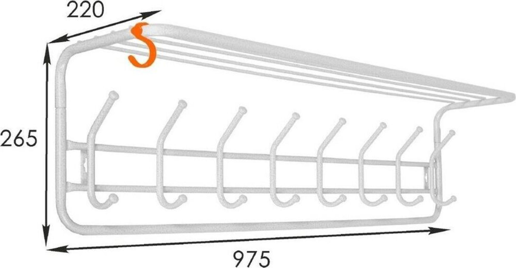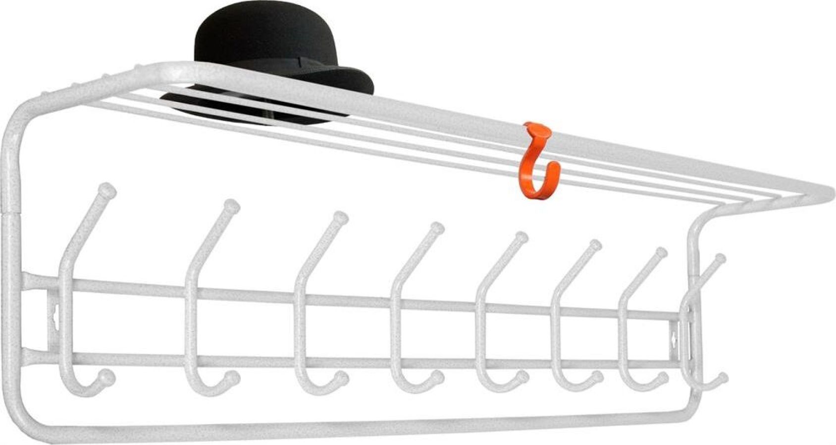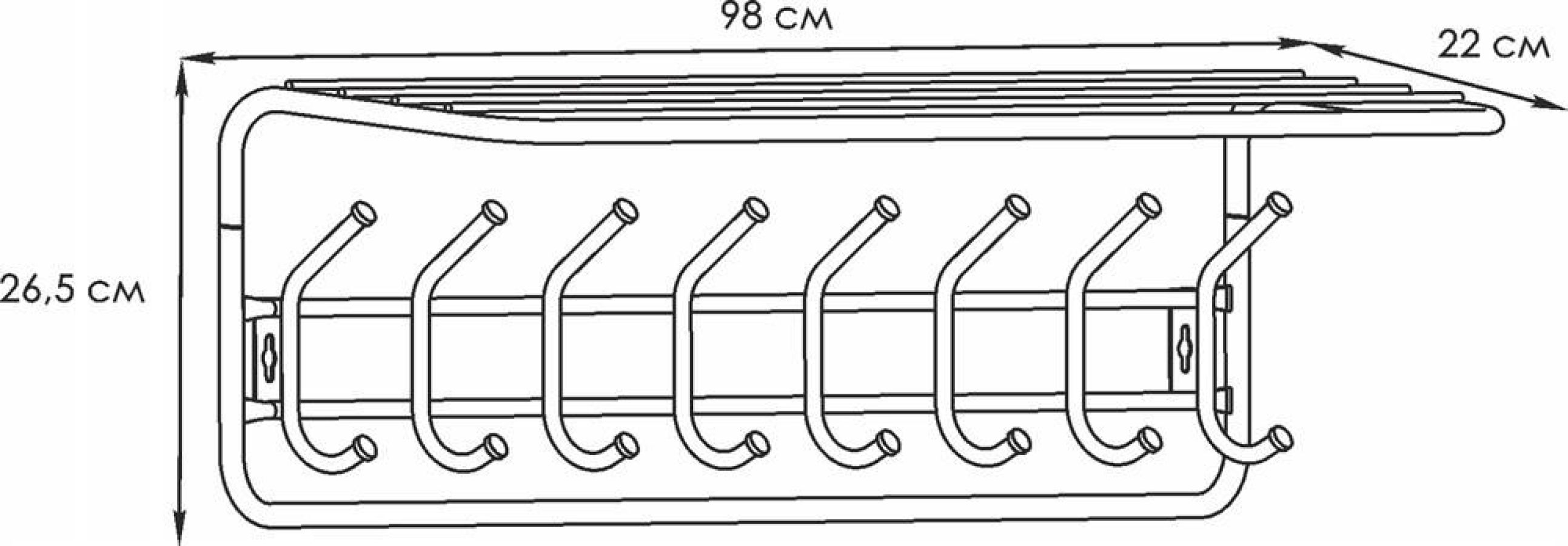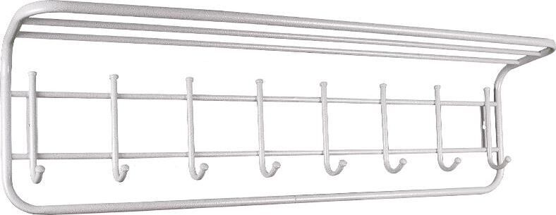 Надежная сборно-разборная конструкция. — компактная вешалка с 8-ю крючками. — удобная полка для хранения головных уборов. — допустимая нагрузка до 5 кг на крючок. — Удобный пластиковый крючок для мелочей. — Расстояние между крепёжными отверстиями 875 мм. Материал Сталь, полимерное покрытие. Габариты (Д*Ш*В) 98х22х26,5 см.
