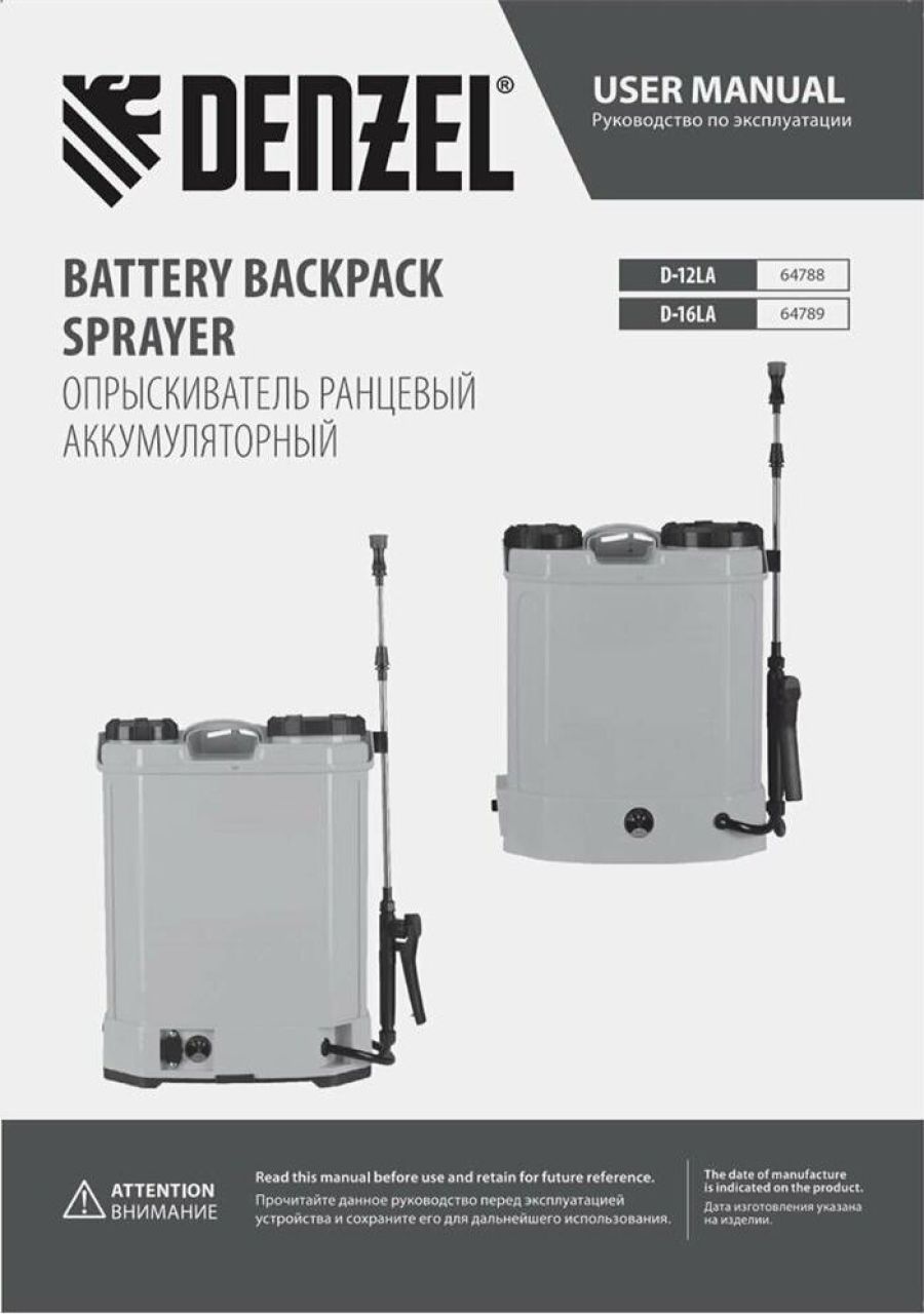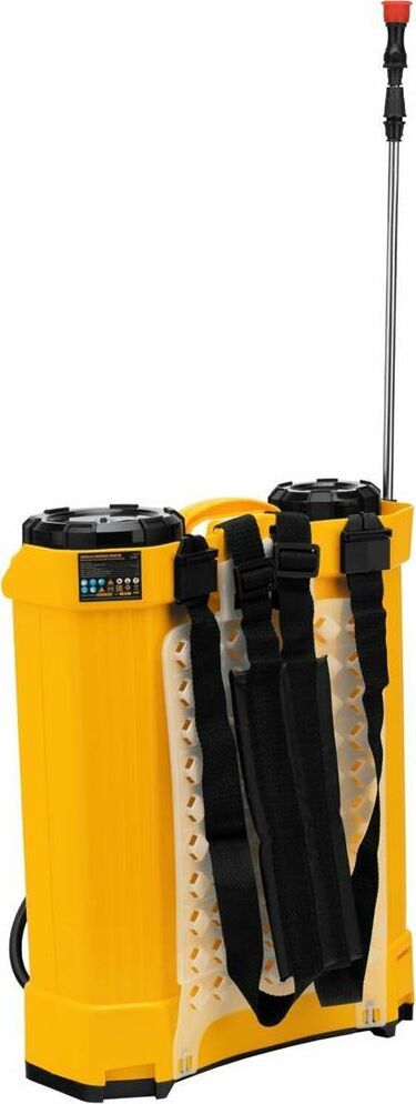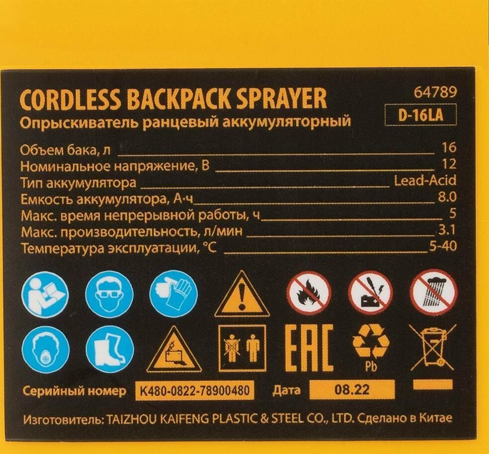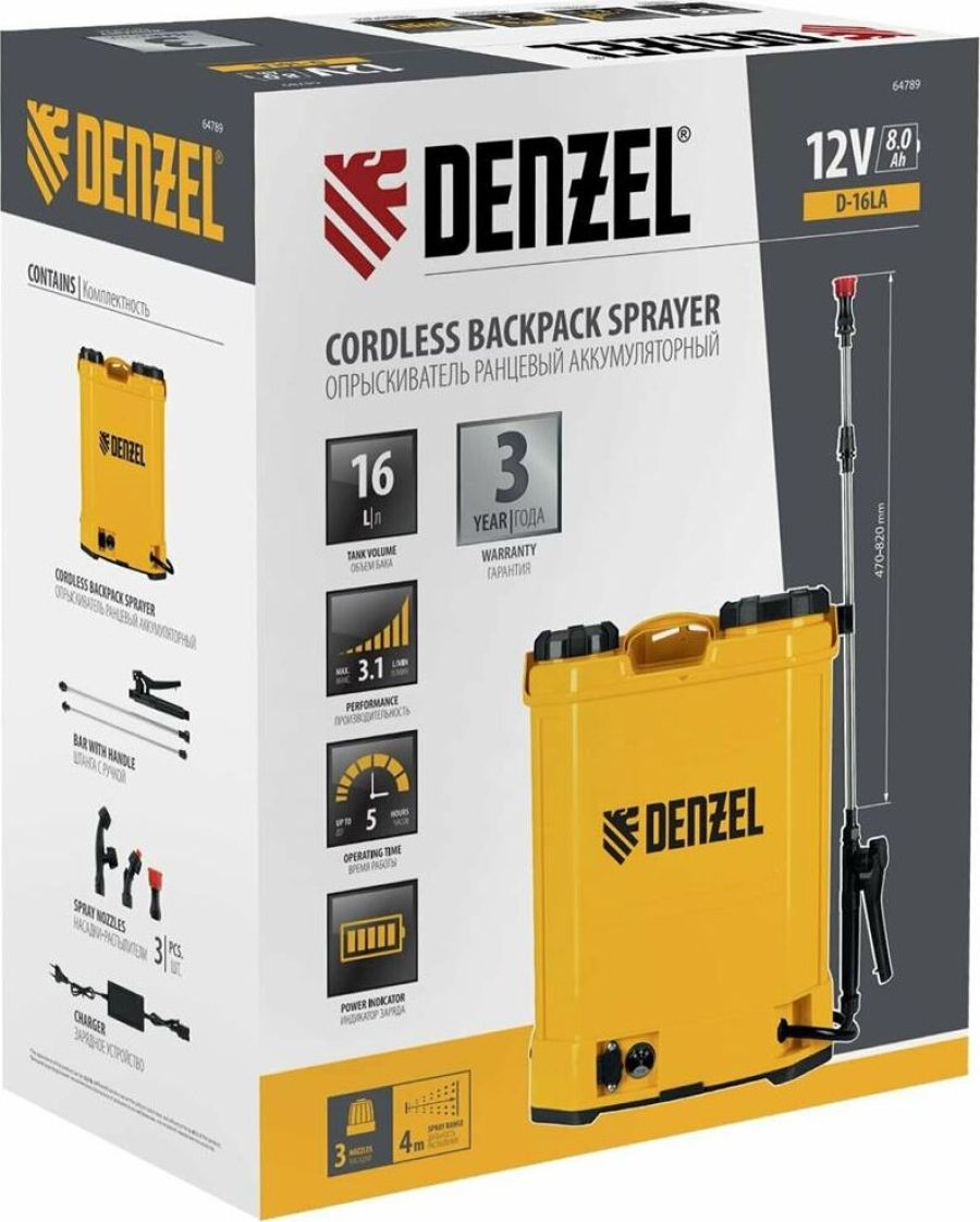 Ранцевый аккумуляторный опрыскиватель Denzel D-16LA 64789 с баком объемом 16 л и батареей на 12 В, емкостью 8 Ач, предназначен для распыления воды или инсектицидов. Используется для ухода за растениями, дезинфекции помещения, мытья окон и фасадов. Длина штанги регулируется в диапазоне 470-820 мм, а максимальная дальность распыления составляет 4 м, что облегчает обработку труднодоступных мест.ПреимуществаБесперебойная работа полного заряда аккумулятора хватает на 5 часов работы, что в сочетании с вместительным баком позволяет обрабатывать участки большой площади без перерывов на дозаправку и подзарядку.Максимально комфортное использование опрыскиватель не зависит от электросети, не требует сложного технического обслуживания и не выделяет неприятного запаха и вредных выхлопов.Контроль уровня заряда аккумулятора опрыскиватель оснащен встроенным вольтметром.