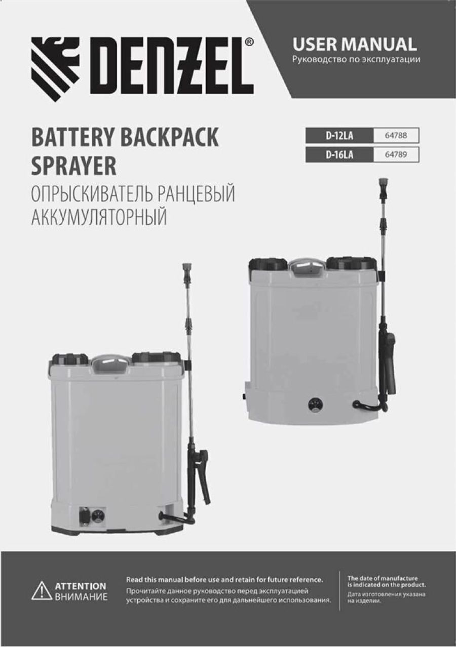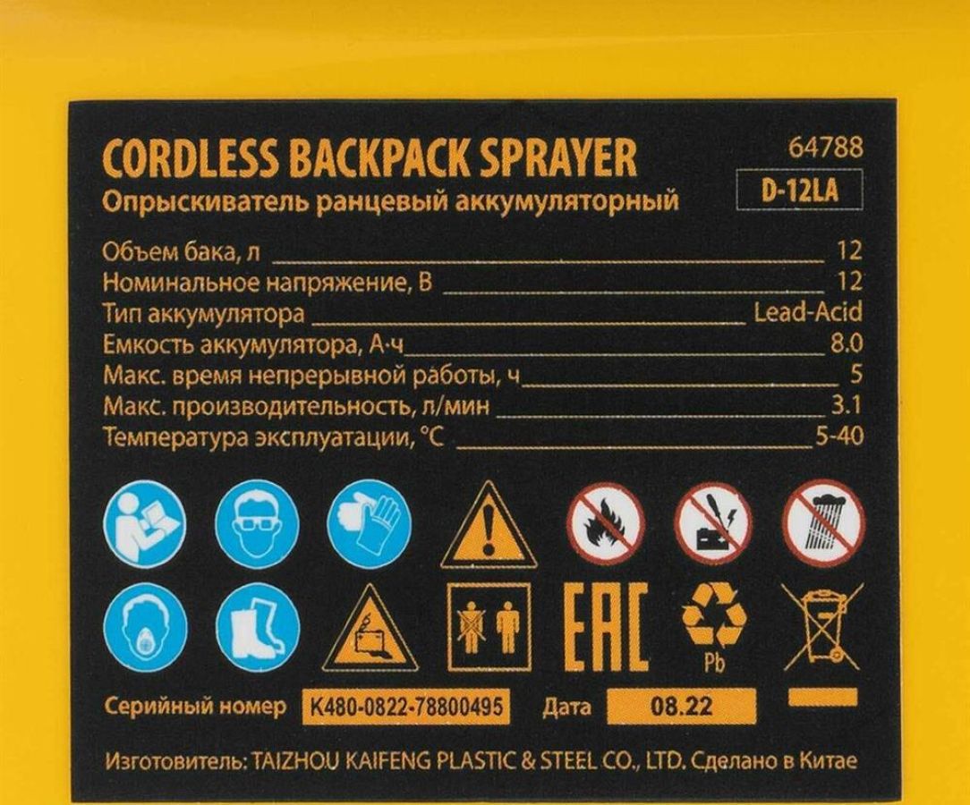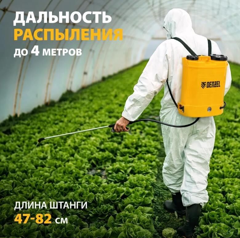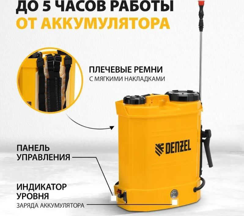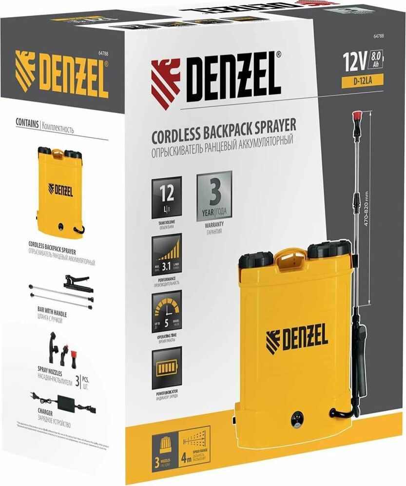 Ранцевый аккумуляторный опрыскиватель Denzel D-12LA 64788 с баком объемом 12 л и батареей на 12 В, емкостью 8 Ач, предназначен для распыления воды или инсектицидов. Используется для ухода за растениями, дезинфекции помещения, мытья окон и фасадов. Длина штанги регулируется в диапазоне 470-820 мм, а максимальная дальность распыления составляет 4 м, что облегчает обработку труднодоступных мест.ПреимуществаБесперебойная работа полного заряда аккумулятора хватает на 5 часов работы, что в сочетании с вместительным баком позволяет обрабатывать участки большой площади без перерывов на дозаправку и подзарядку.Максимально комфортное использование опрыскиватель не зависит от электросети, не требует сложного технического обслуживания и не выделяет неприятного запаха и вредных выхлопов.Контроль уровня заряда аккумулятора опрыскиватель оснащен встроенным вольтметром.