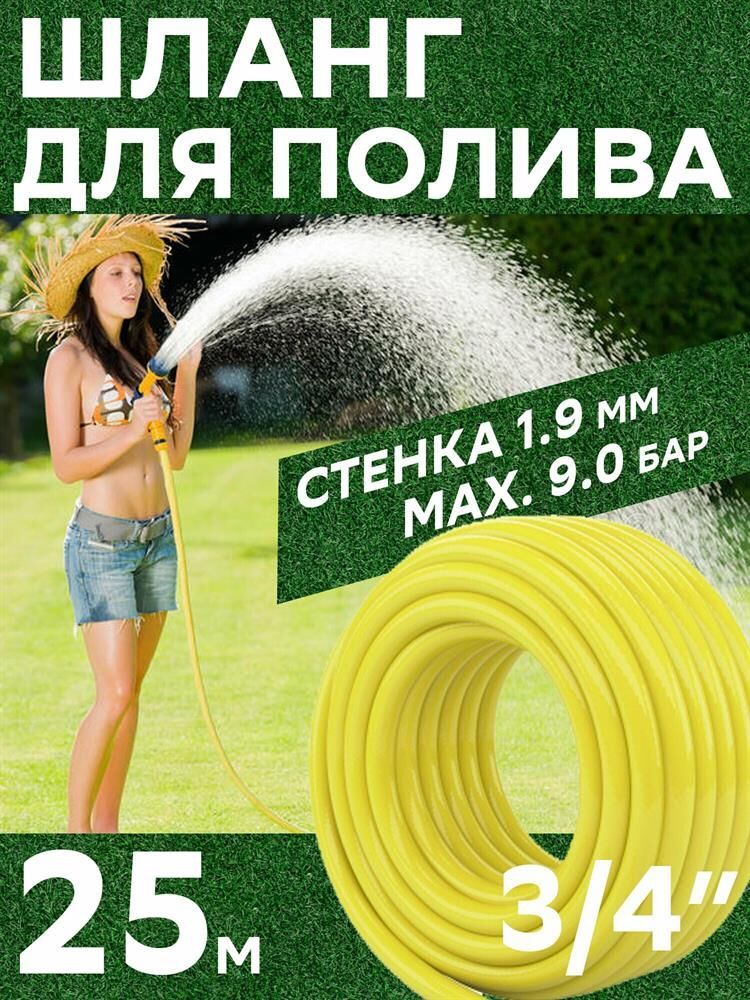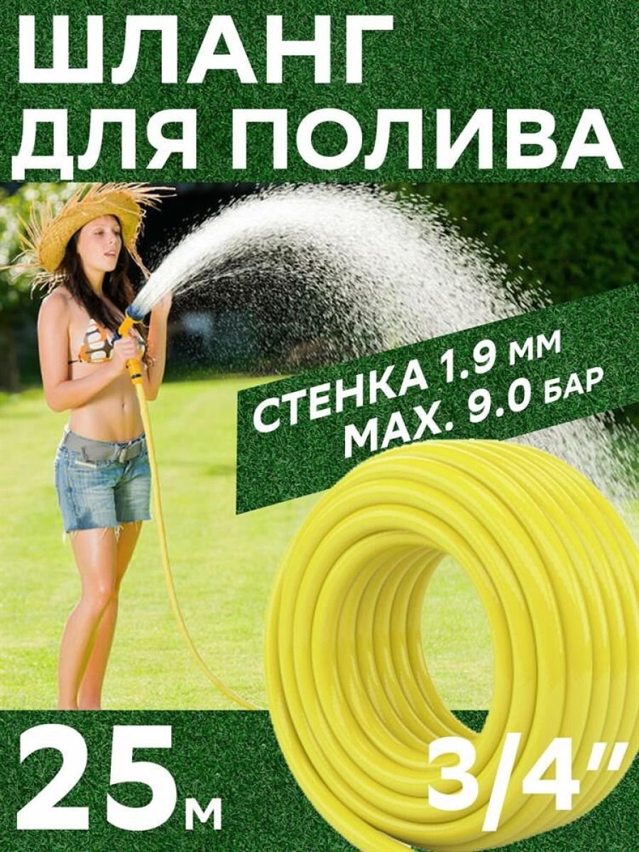 Тип поливочный. Длина 25 м. Диаметр 3/4 дюйм. Толщина стенки 1.9 мм. Материал ПВХ. Максимальное давление 9 бар. Количество слоев 3. Температура эксплуатации от 0 до +50 °С.