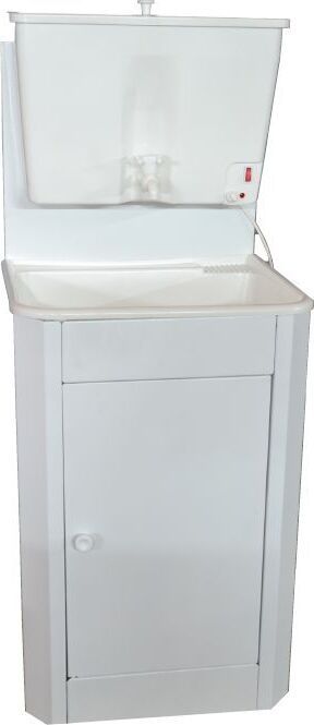 Умывальник с ЭВН плас.мойка/плас.бак разборный, цвет белый Габариты 420х500*1135, С водонагревателем Мойка-пластик. Бак-пластик-17л Мощность нагревателя – 1,25 кВт (при достижении 60 градусов атоматически отключается) Размер бака: 345х480х100 (высота, ширина, глубина) Задняя стенка бака: 740х480х380 Размер тумбы: 740х480х380