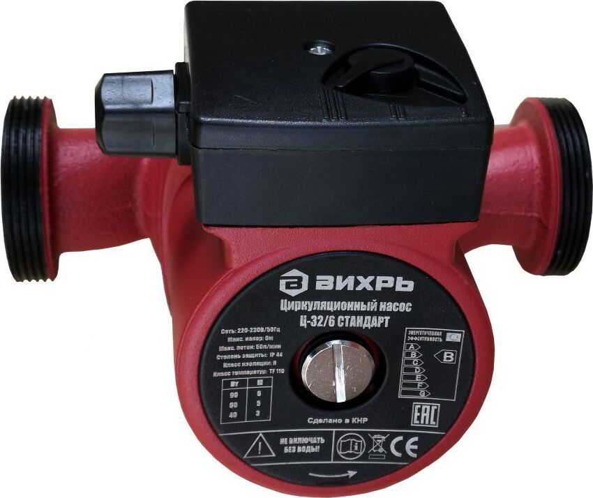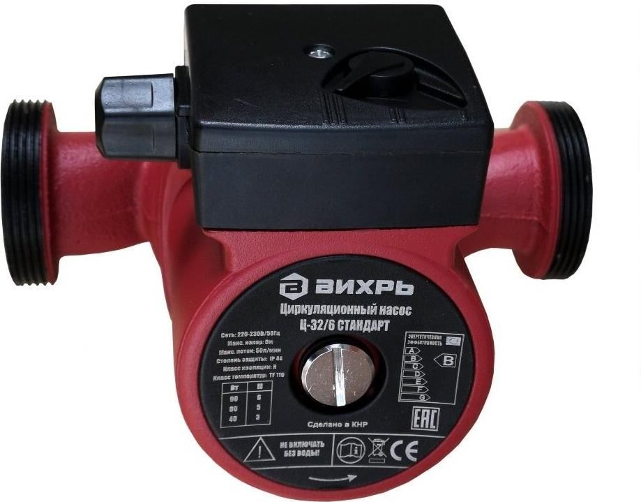 Циркуляционный насос Вихрь Ц-32/6 СТАНДАРТ. Мощность, Вт – 40/60/90; Напор, м – 3/5/6; Максимальный поток, л/мин – 50; Резьба на насосе, дюйм – 2;