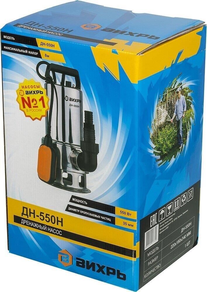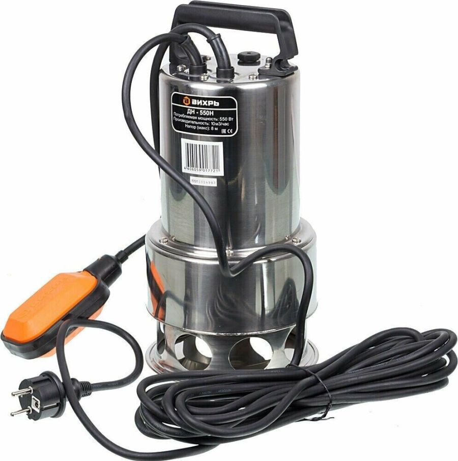 Мощность 550Вт, максимальная высота подъема 8м, максимальная подача 10 м3/час, диаметр пропускаемых частиц 35мм, материал корпуса нержавеющая сталь, электродвигатель асинхронный, однофазный с короткозамкнутым ротором.