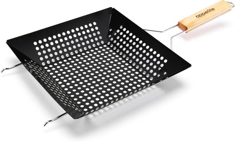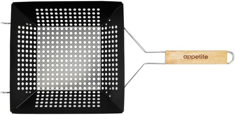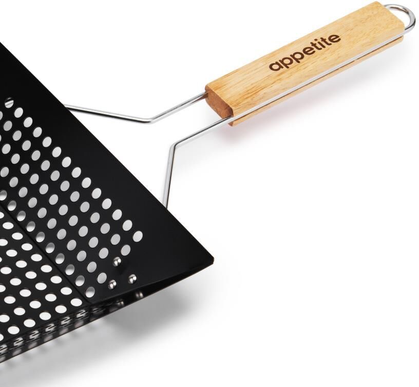 Кастомизированная деревянная ручка, есть усики, антипригарное покрытие, длина рабочей поверхности 30,5см, ширина 31см, длина вместе с ручкой 61см, длина вместе с усиками и ручкой 65см, толщина металла 1мм