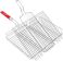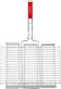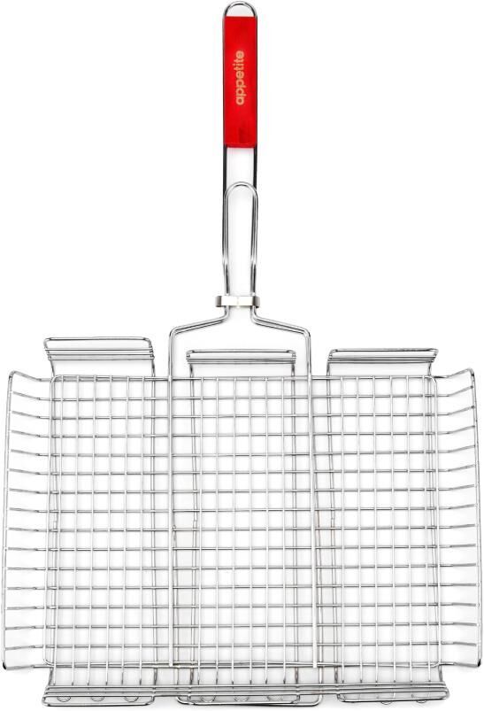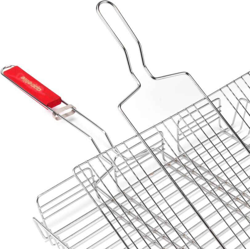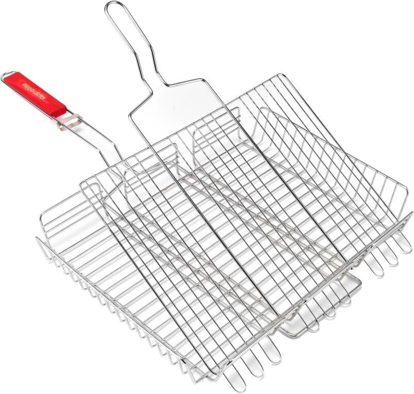 Хромированная сталь, кастомизированная деревянная ручка, длина рабочей поверхности 44см, ширина 33,5см, длина вместе с ручкой 69см, глубина 6см, толщина прута 4,5мм / 3,8мм / 2мм