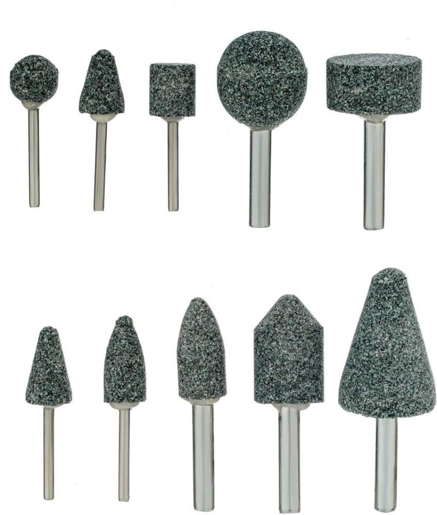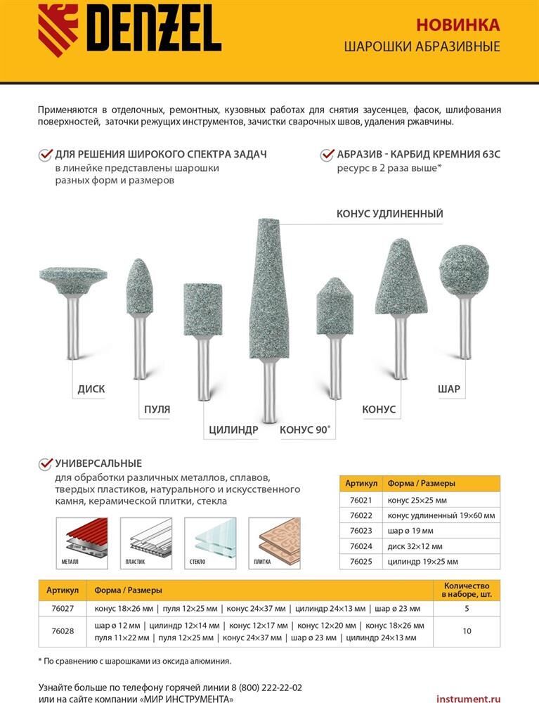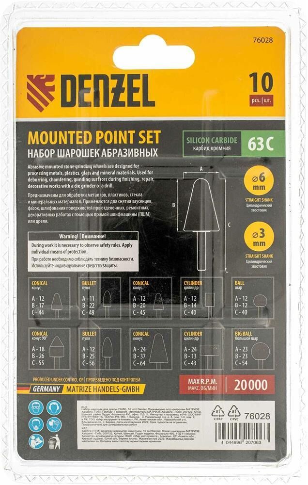 Набор Denzel 76028 включает в себя 10 шарошек для дрели, шуруповерта или прямошлифовальной машины (ПШМ). Оснастка предназначена для зачистки сварных швов, канавок, углублений, снятия фасок и заусенцев, расширения отверстий и обработки деталей с рельефной поверхностью. Набор шарошек пригодится в ремонтной мастерской, автосервисе, будет полезен при выполнении отделочных работ.ПреимуществаИзносостойкость — карбид кремния (63C) сохраняет рабочие свойства вдвое дольше, чем оксид алюминия.Универсальность — шарошки подходят для обработки металла, различных сплавов, стекла, пластика, керамической плитки, натурального и искусственного камня.Решение широкого спектра задач — в набор входят шарошки наиболее популярных размеров и форм (конус, пуля, цилиндр, шар).
