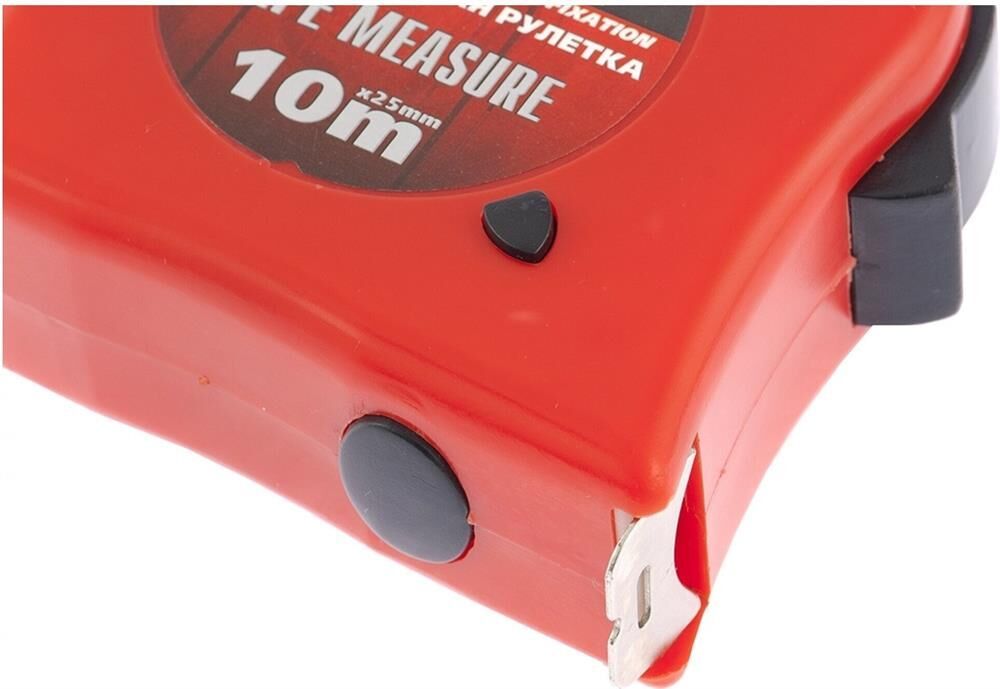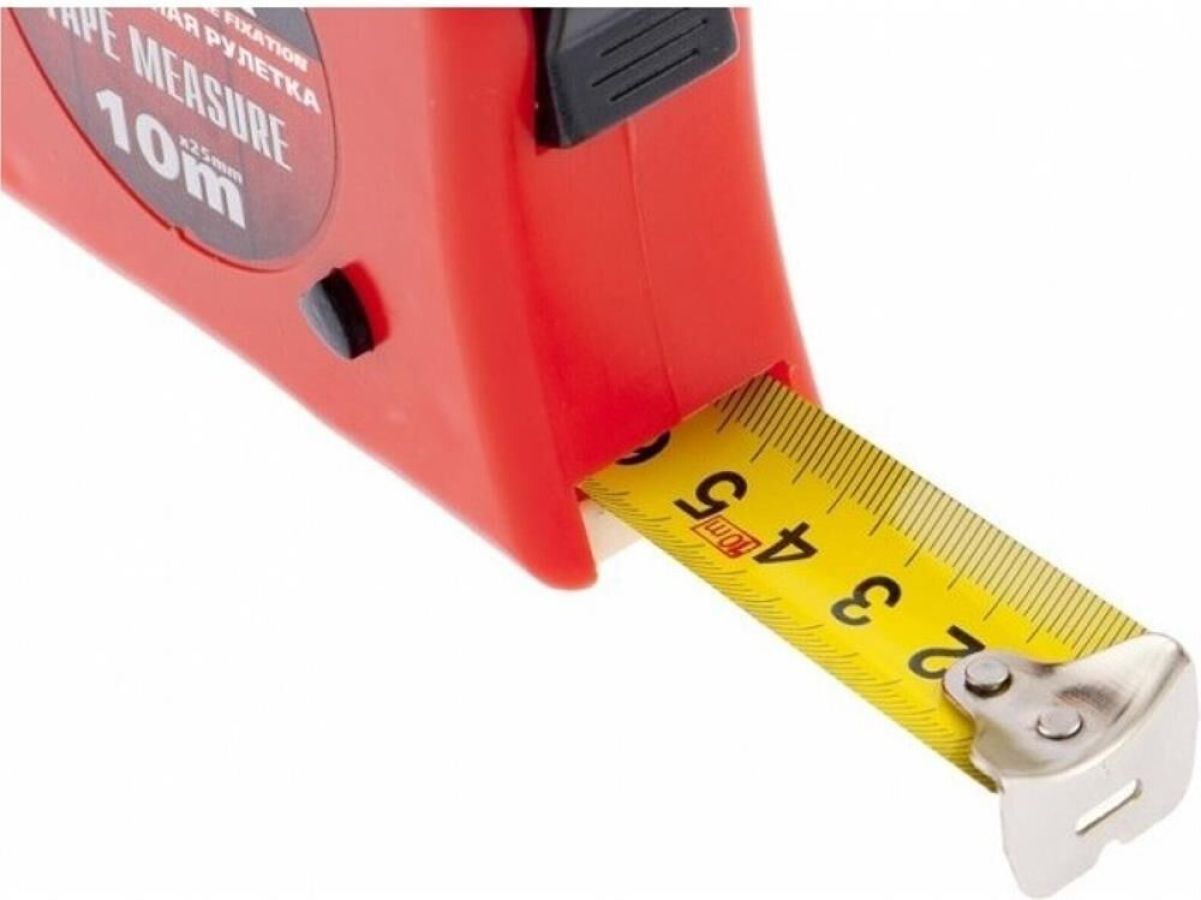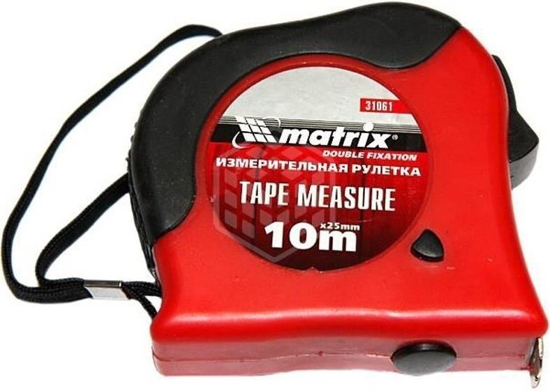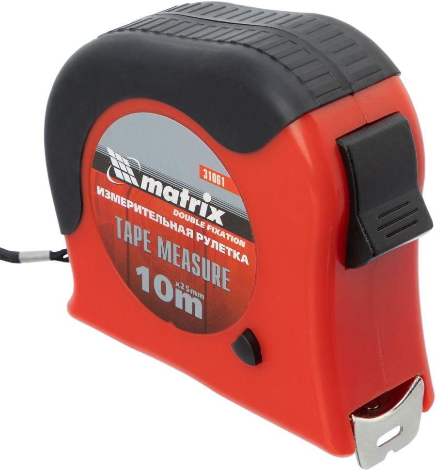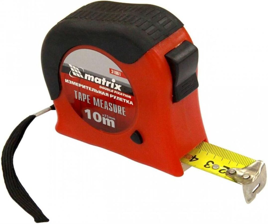 Рулетка Matrix Double fixation 31061, 10 м х 25 мм, в обрезиненном корпусе, с двойной плавной фиксацией, предназначена для определения расстояния между двумя точками. Двухкомпонентный корпус из ударопрочного ABS-пластика и ПВХ обеспечивает защиту от механических повреждений. Зацеп надежно зафиксирован заклепками на конце измерительной ленты. Инструмент используется при выполнении строительных и ремонтных работ, а также полезна в быту.ПреимуществаДве кнопки фиксации ленты — стопор и боковая кнопка-пауза, облегчающая проведение частых измерений.Нейлоновый ремешок, позволяющий носить рулетку на запястье.Металлическая скоба, при помощи которой можно закрепить рулетку на поясе.