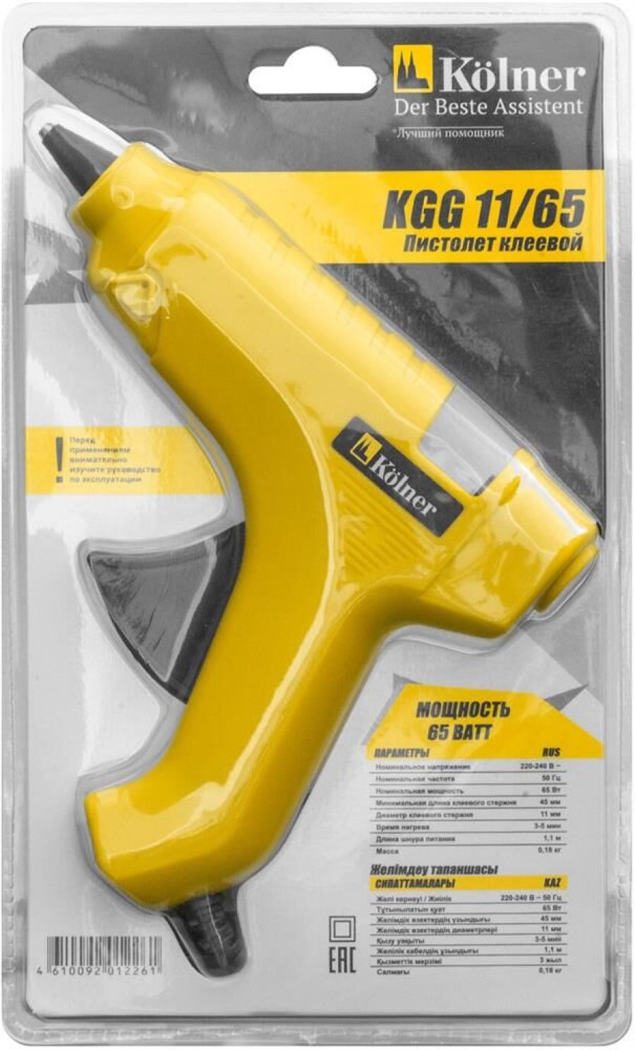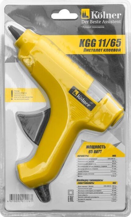 Номинальное напряжение/Частота: 220-240 В ~ 50 Гц. Номинальная мощность: 65 Вт. Минимальная длина клеевого стержня: 45 мм. Диаметр клеевого стержня: 11 мм. Время нагрева: 3-5 мин. Длина шнура питания: 1,1 м. Масса: 0,18 кг.