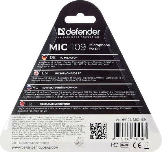 Микрофон компьютерный, тип подключения - проводной, разъемы 3,5-мм джек, частотный диапазон -20-13000 Гц, чувствительность - 54 дБ, импеданс - 2,2 кОм, материал корпуса - пластик, длина кабеля - 1,5 м.