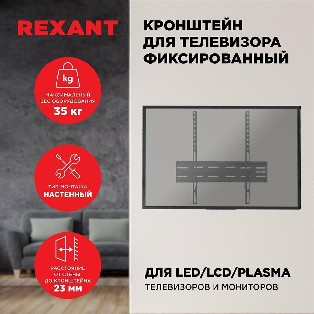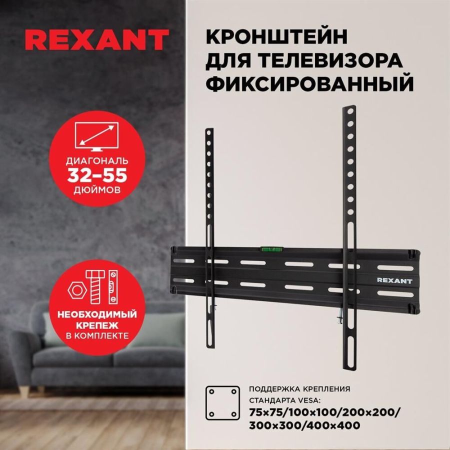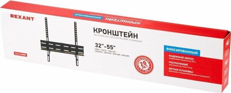 Кронштейн на стену для телевизора диагональю: 32"-55" дюймов фиксированный REXANT серия HOME Тип: фиксированный Назначение: для LED/LCD/PLASMA телевизоров и мониторов Цвет: черный Мин. диагональ: ТВ 32 дюйма Макс. диагональ: ТВ 55 дюймов Максимальный вес оборудования: 35 кг Тип монтажа: настенный Расстояние от стены до кронштейна: 23 мм Поддержка крепления стандарта VESA: 75х75/100х100/200x200/300x300/400x400 Пузырьковый уровень: в комплекте Крепление: в комплекте