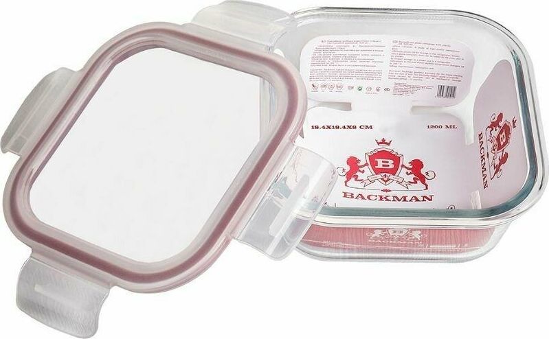 Контейнер для хранения, 18.4х18.4х8 см 1200 мл, корпус из термостойкого боросиликатного стекла, крышка из пластика. Возможность использования для хранения в холодильнике, морозильной камере, для запекания в духовом шкафу. Подарочная упаковка.