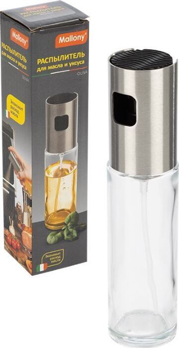 Распылитель для масла и уксуса Объем: 100 мл Размер: 4*4*17,6 см Материал: нерж сталь, полипропилен, натрий-кальций-силикатное стекло Инд.упаковка: цветная коробка. Экономит расход масла.