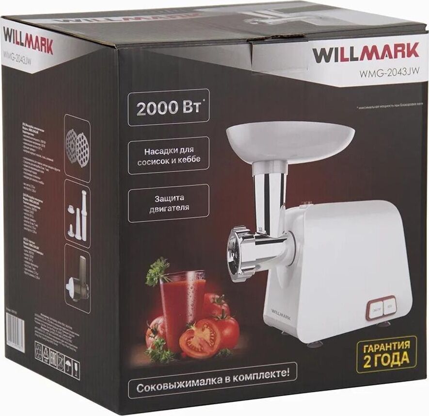 Мощность (Вт): 2000; Напряжение (В): 230; Насадка для набивки колбас: есть; Насадка-соковыжималка: есть; Реверс: Есть; Решетки: 2, средняя, крупная.; Частота (Гц): 50; Защита двигателя от перегрузки.Лезвие: нержавеющая сталь;