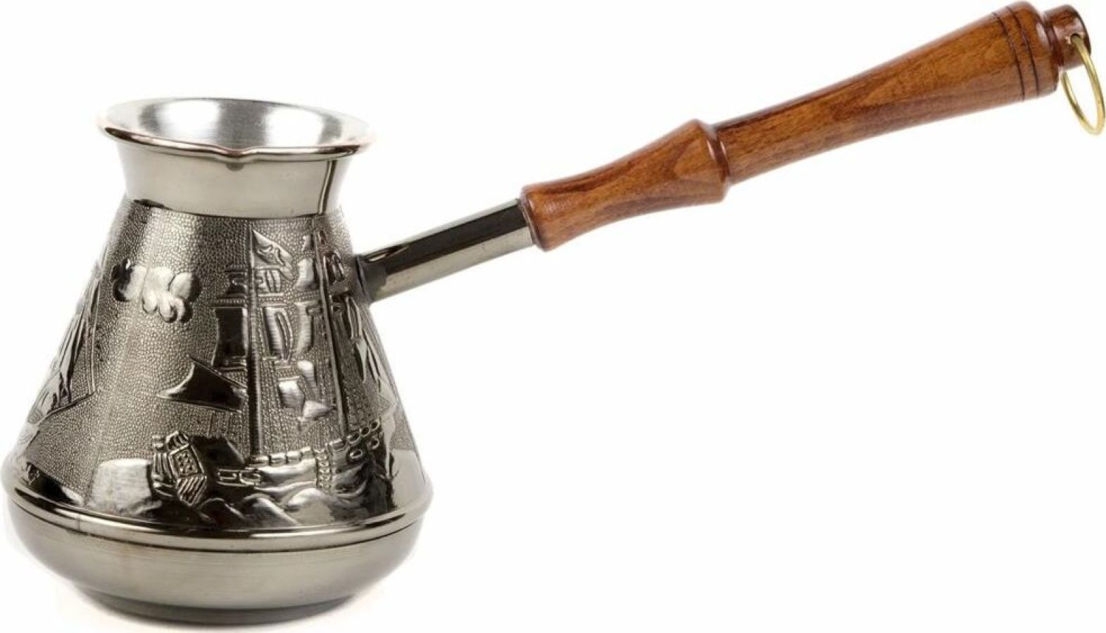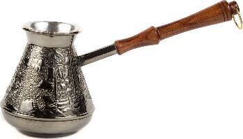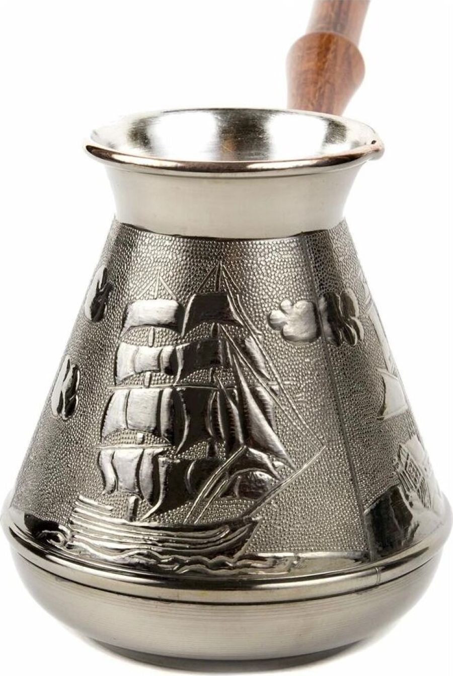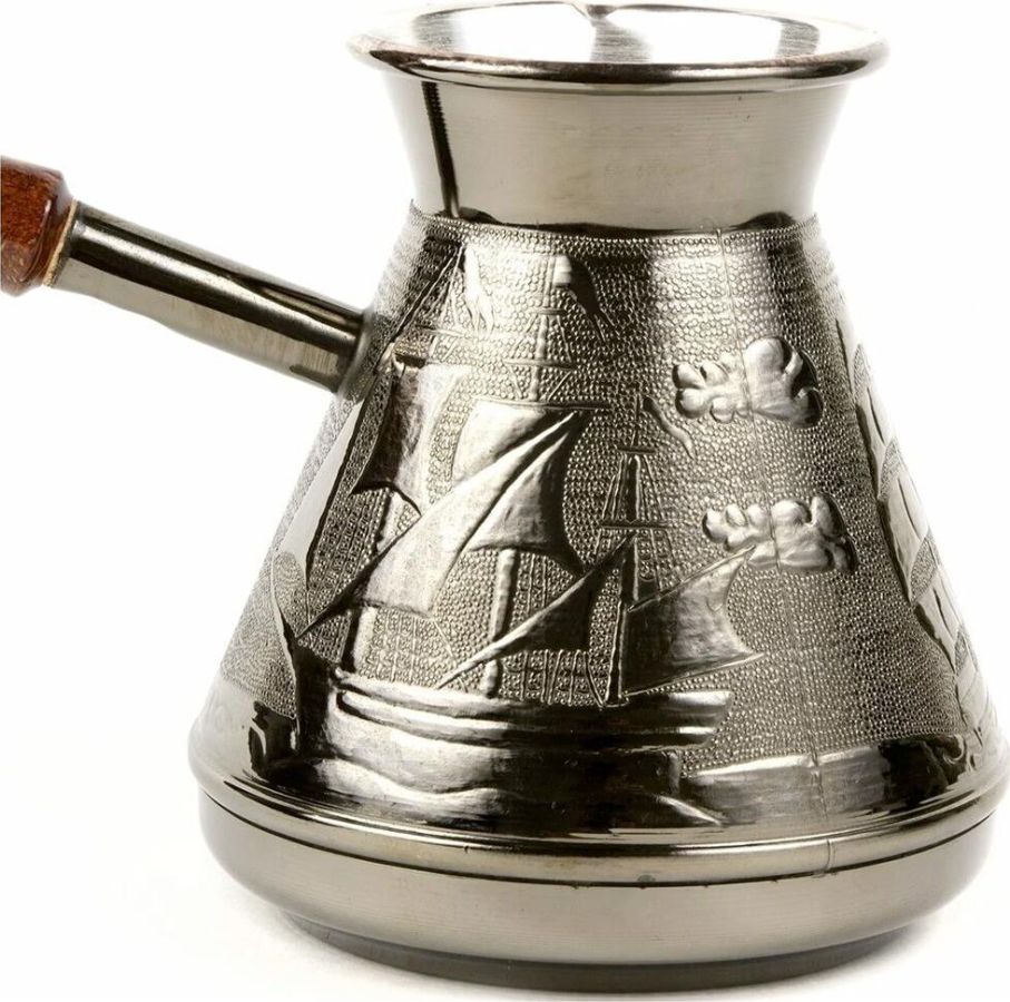 "Алые Паруса" Медная турка классической конусообразной формы с утолщённым дном предназначена для приготовления ароматного натурального кофе. Внутренняя поверхность покрыта пищевым оловом. Наружная сторона украшена оригинальным орнаментом. Деревянная ручка является надёжным теплоизолирующим материалом. Подходит для всех типов плит, кроме индукционных. Проста в эксплуатации. Объём: 500 мл.