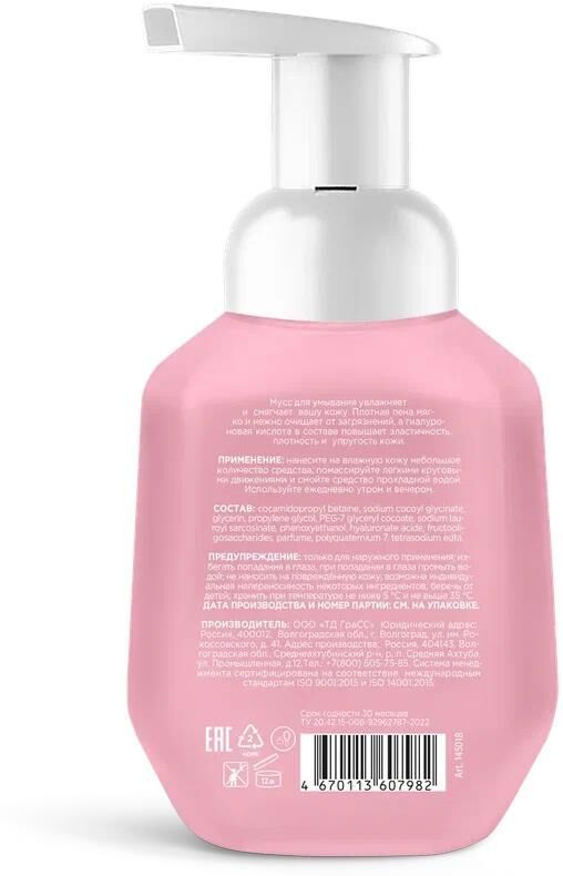 Мусс для умывания на основе мягких пав увлажняет и смягчает вашу кожу. Плотная пена мягко и нежно очищает от загрязнений, а гиалуроновая кислота в составе повышает эластичность, плотность и упругость кожи. Состав: Aqua, cocamidopropyl betaine, sodium cocoyl glycinate, glycerin, propylene glycol, PEG-7 glyceryl cocoate, sodium lauroyl sarcosinate, phenoxyethanol, hyaluronate acide, fructooligosaccharides, parfume, polyquaternium 7, tetrasodium edta. Способ применения: нанесите на влажную кожу небольшое количество средства, помассируйте легкими круговыми движениями и смойте средство прохладной водой. Используйте ежедневно утром и вечером.