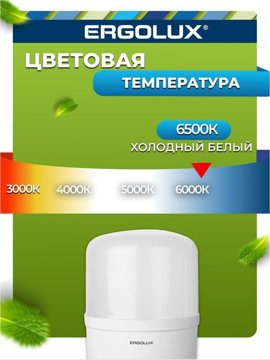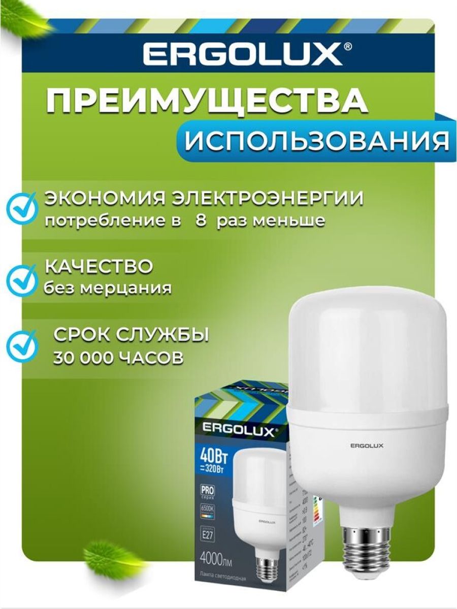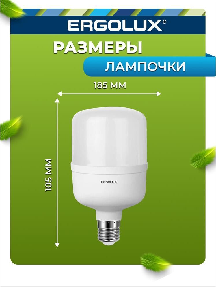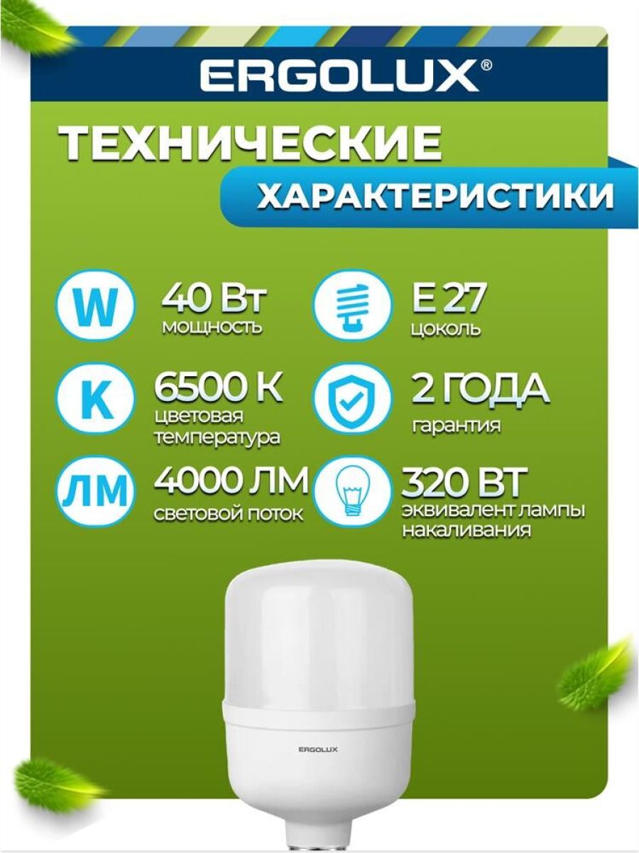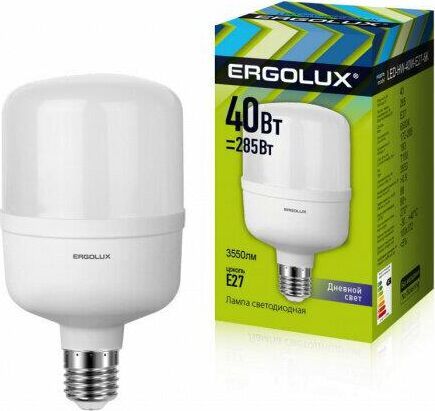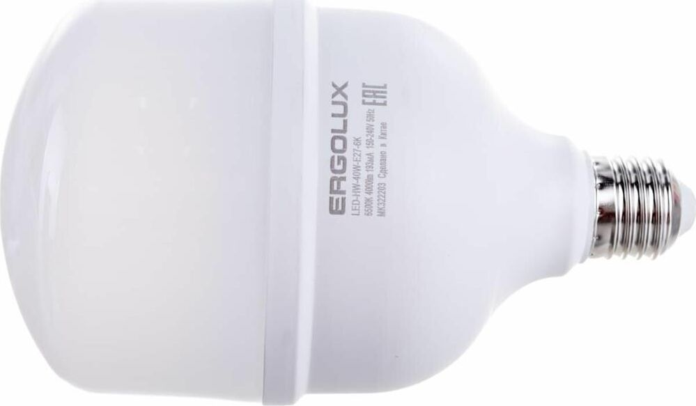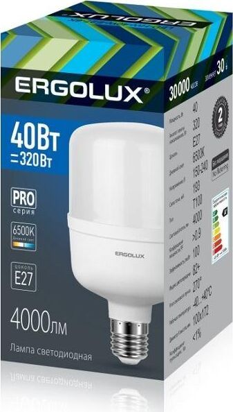 LED лампа, Мощность 40 Вт, Эквивалент лампы накаливания 320 Вт, Цоколь E27 Цветовая температура 6500 К, Световой поток 4000 лм, Светоотдача 100 лм\Вт Угол светового пучка 270, Индекс цветопередачи 82+ Диапазон рабочего напряжения 150-270 Драйвер IC Гарантия 2 года