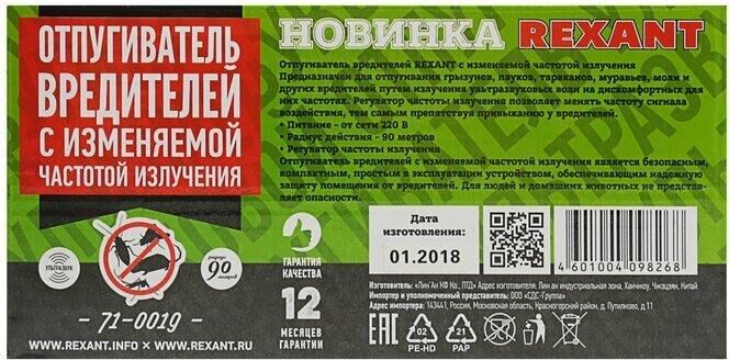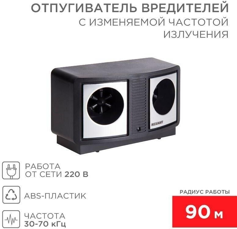 Отпугиватель вредителей с изменяемой частотой излучения Предназначен для отпугивания грызунов, пауков, тараканов, муравьев, моли и других вредителей путем излучения ультразвуковых волн на дискомфортных для них частотах. Регулятор частоты излучения позволяет менять частоту сигнала воздействия, тем самым препятствуя привыканию у вредителей. Отпугиватель вредителей с изменяемой частотой излучения является безопасным, компактным, простым в эксплуатации устройством, обеспечивающим надежную защиту помещения от вредителей. Для людей и домашних животных не представляет опасности. Радиус работы: 90 метров Питание: 220 В (кабель 1,3 метра) Частота: 30-70 кГц Потребляемая мощность: 9 Вт Материал: пластик ABS Размер: 14*7*9 см Вес: 320 гр