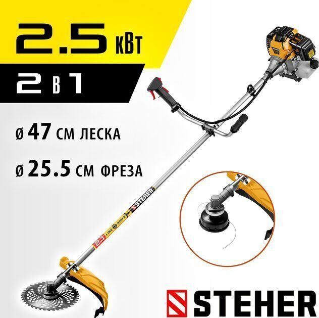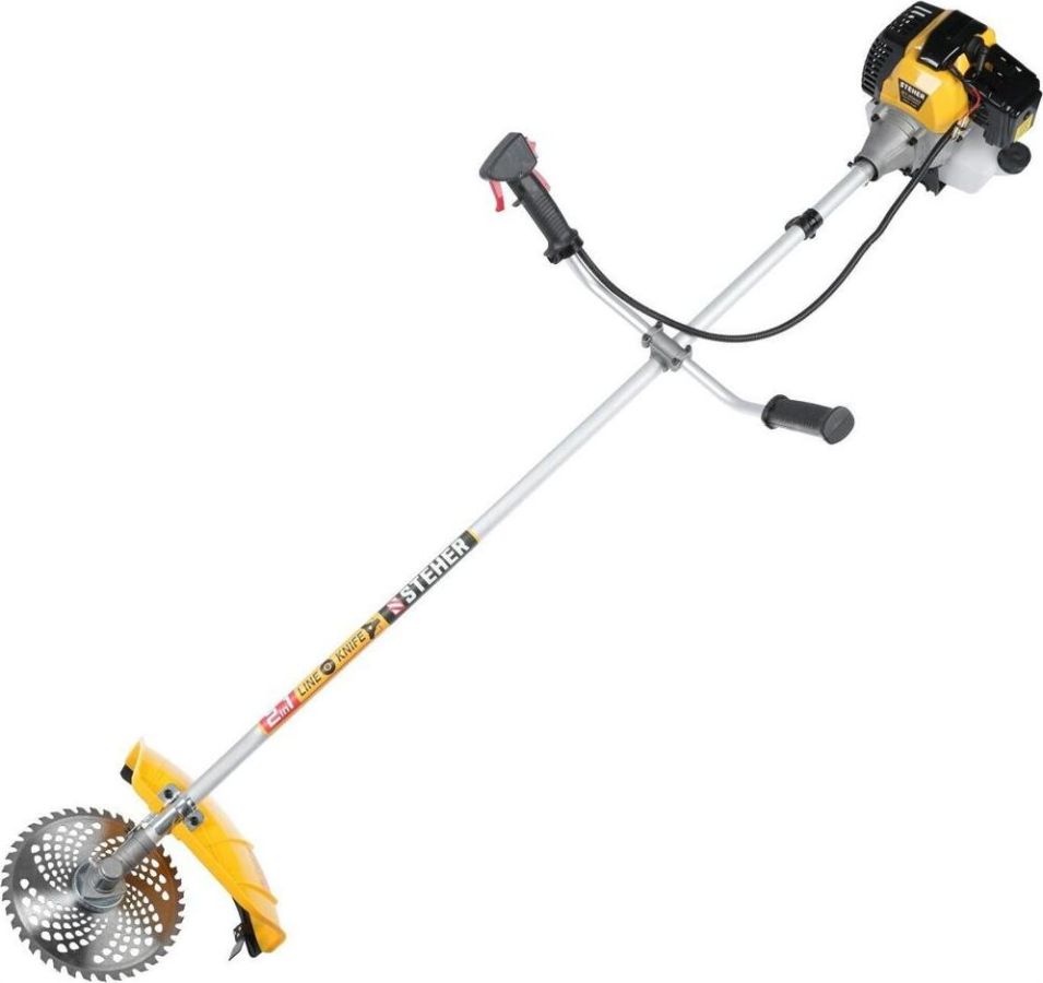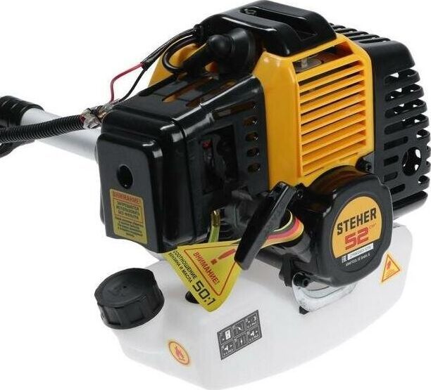 Габариты, см: 103x29x31 Мощность, л.с.: 3.3 Плечевой ремень: есть Приводной вал: жесткий Тип двигателя: бензиновый Тип ручки: u-образная (велосипедная) Частота вращения шпинделя, об/мин: 9000 Ширина скашивания для ножа, мм: 255 Мощность, кВт: 2.5 Режущий элемент: леска/диск Вес, кг: 7.3 Объем двигателя, см3: 52 Емкость бака, л: 1.2 Толщина лески, мм: 2 Ширина скашивания для лески, мм: 470 КОМПЛЕКТАЦИЯ: Коса бензиновая - 1 шт. Велосипедная рукоятка - 1 шт. Кожух защитный - 1 шт. Нож - 1 шт. Катушка с леской - 1 шт. Ключ (свечной, гаечный, имбусовый) - 3 шт. Фиксатор вала - 1 шт. Плечевой ремень - 1 шт. Емкость для смешивания - 1 шт. Руководство по эксплуатации - 1 экз.