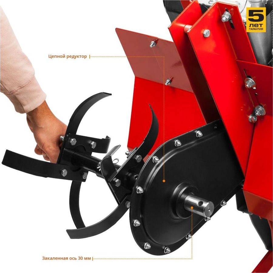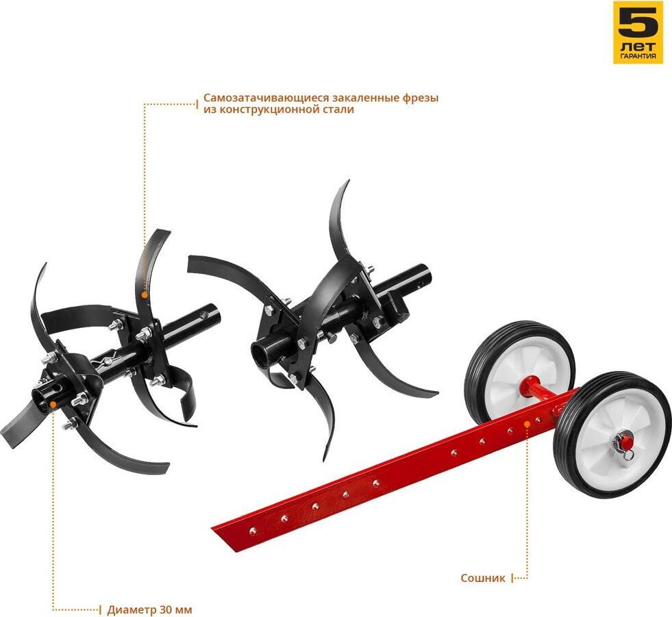 Комплект поставки: руководство по эксплуатации, сошник, комплект ключей, хомуты крепления тросов, крепеж для сборки фрез, транспортировочное колесо
