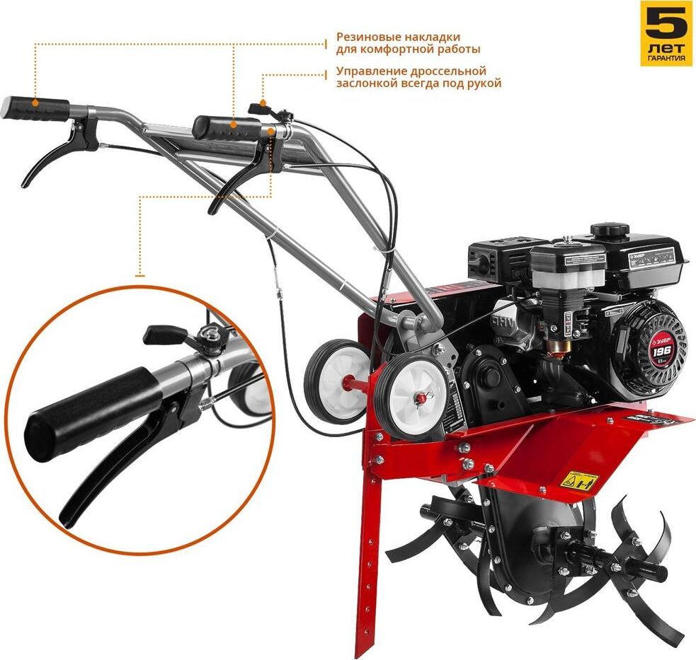 Культиватор бензиновый 196 см3, 550 мм ширина обработки, скорости: 1 вперед / 1 назад. Надёжный и манёвренный культиватор для рыхления и культивации почвы на приусадебном участке. Эффективный двигатель с воздушным фильтром в масляной ванне увеличивает моторесурс. Складываемые, регулируемые по положению рукоятки и транспортное колесо облегчают эксплуатацию, транспортировку и хранение