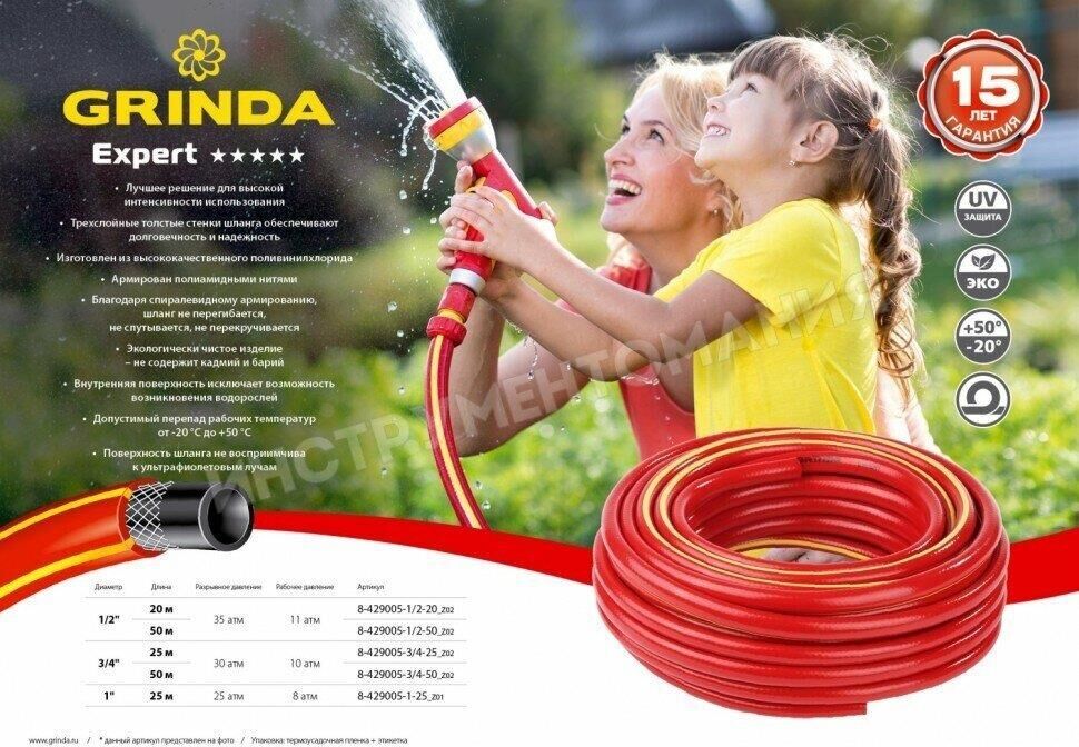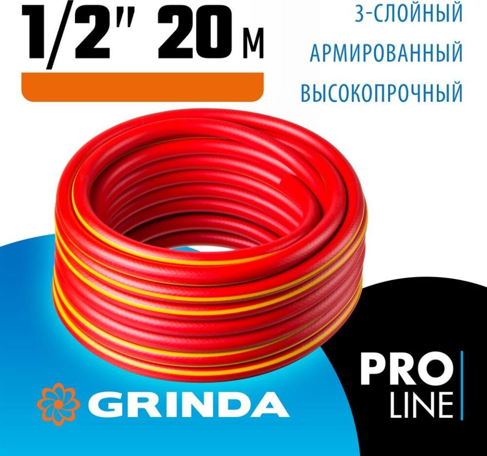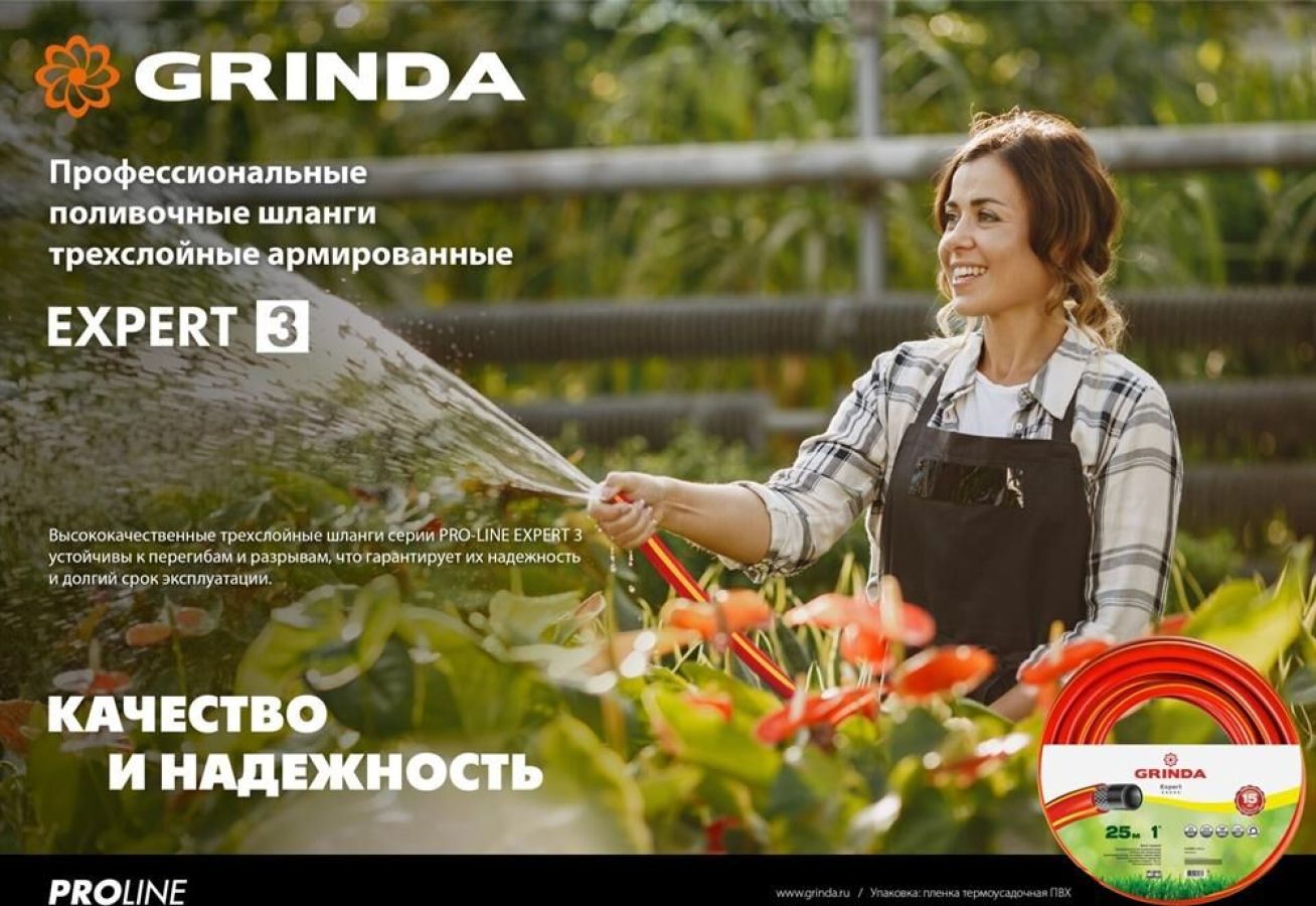 Комплектация: Шланг поливочный GRINDA PROLine EXPERT 3 1/2 20 м 35 атм трехсл. армир