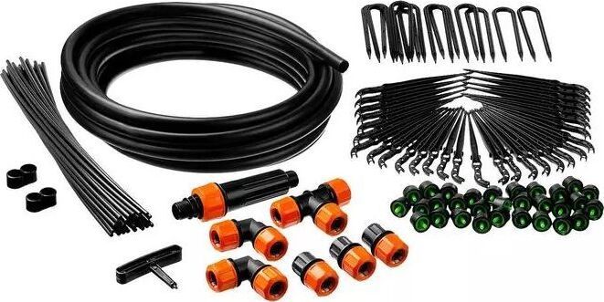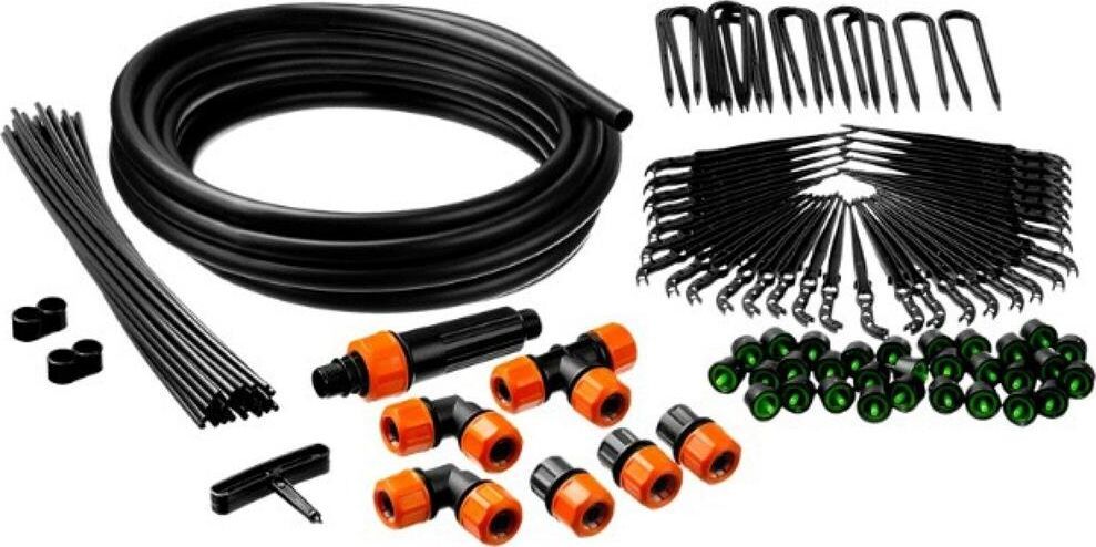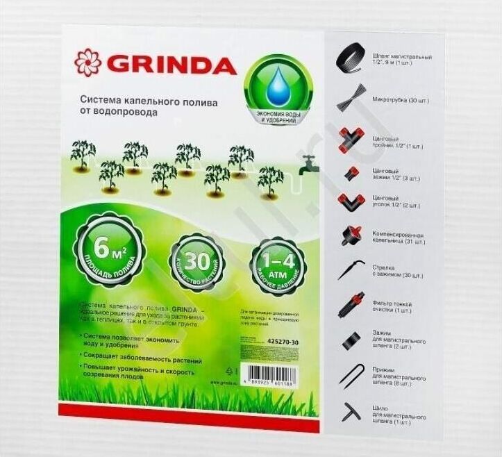 Комплектация: шланг магистральный 1/2" 9 м - 1 шт, микротрубка - 30 шт, цанговый тройник 1/2" - 1 шт, цанговый зажим 1/2" - 3 шт, цанговый уголок 1/2" - 2 шт, компенсированная капельница - 31 шт, стрелка с зажимом - 30 шт, фильтр тонкой очистки - 1 шт, зажим для магист