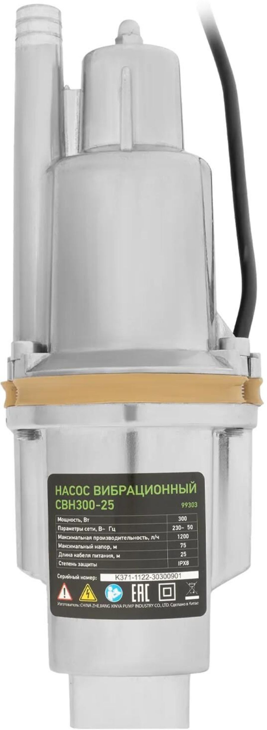 Номинальное напряжение - 230 В Резьба - 3/4" Степень защиты от влаги и пыли - IPX8 Тип ротора - сухой Установка насоса - вертикальная Тип - бочечный, колодезный, скважинный Мощность, Вт - 300 Длина кабеля питания, м - 25 Забор воды - верхний Качество воды - чистая Крепление насоса - трос Максимальная глубина погружения, м - 5 Максимальная температура воды, °C - 35 Максимальный диаметр прокачиваемых частиц, мм - 1 Максимальный напор, м - 75 Материал корпуса насосной части - алюминиевый сплав Материал крыльчатки/винта/мембраны - резина Минимальная температура воды, °C - 1 Остаточный уровень воды, мм - 300 Производительность, л/мин - 20 Тип насосной части - вибрационный Уровень шума, дБ – 80 Комплектация товара Насос - 1 шт Трос - 1 шт Хомут - 1 шт Руководство по эксплуатации - 1 1 шт