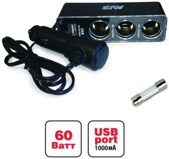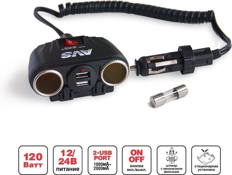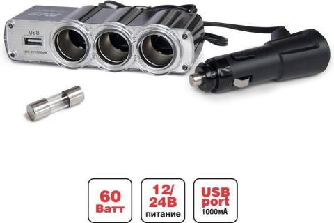 Разветвитель позволяет подключать до 4-х устройств одновременно в разъем прикуривателя через 2 разъема прикуривателя и 2 USB порта. Уникальный штекер с механизмом фиксации. Кнопка включения и выключения питания. Крепкое надежное устройство в корпусе из огнестойкого пластика. Защита от короткого замыкания и перепадов напряжения. Возможность установки в любой части автомобиля, благодаря проводу длиной 1 метр. Работа в сетях с номинальным напряжение 12В и 24В. Универсален для любых автомобилей. Характеристики •Питание: 12/24 В •Мощность: 120 Вт •Максимальный выходной ток: 10 А •Защита от короткого замыкания •Количество гнезд: 2 •USB порты: 2 •Выходной ток USB портов: 1000 мА + 2000 мА •Длина провода: 1м •Светодиодный индикатор сети •Кнопка ключения/отключения питания •Плавкий предохранитель в корпусе штекера •Штекер с механизмом фиксации Материал: пластик Комплектация •Разветвитель •Предохранитель