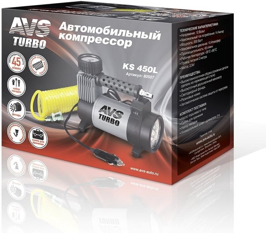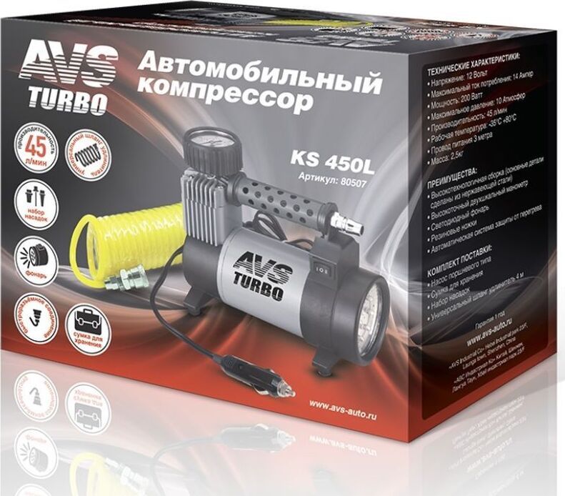 Автомобильный компрессор AVS "KS450L" предназначен для накачки воздухом шин легковых и коммерческих автомобилей. Рабочее напряжение компрессора - 12В. Высокая производительность делает возможным более широкое применение. Автомобильный компрессор может быть использован для накачки мячей, матрасов, проведения покрасочных работ. Максимальный ток потребления: 14 А Напряжение: 12 В Мощность: 200 W Максимальное давление: 10 Атм. Производительность: 45 л/мин Рабочая температура: от -35°С до +80°С Длина кабеля: 3 м Масса: 2.5 кг Комплектация: Компрессор Набор насадок Сумка для хранения Шланг удлинитель 5 м