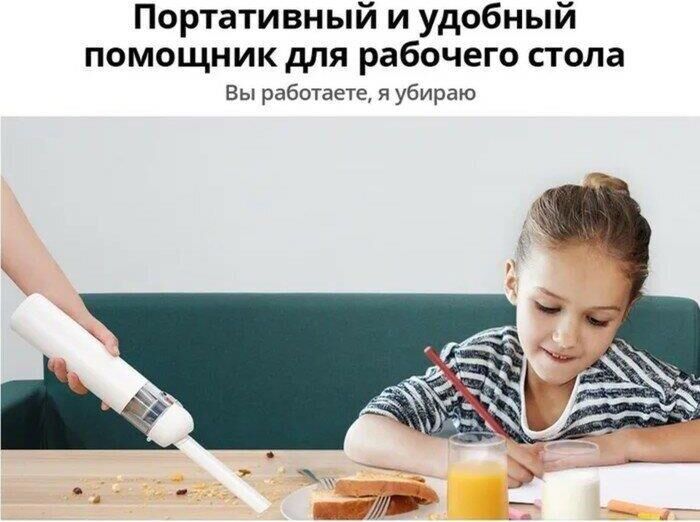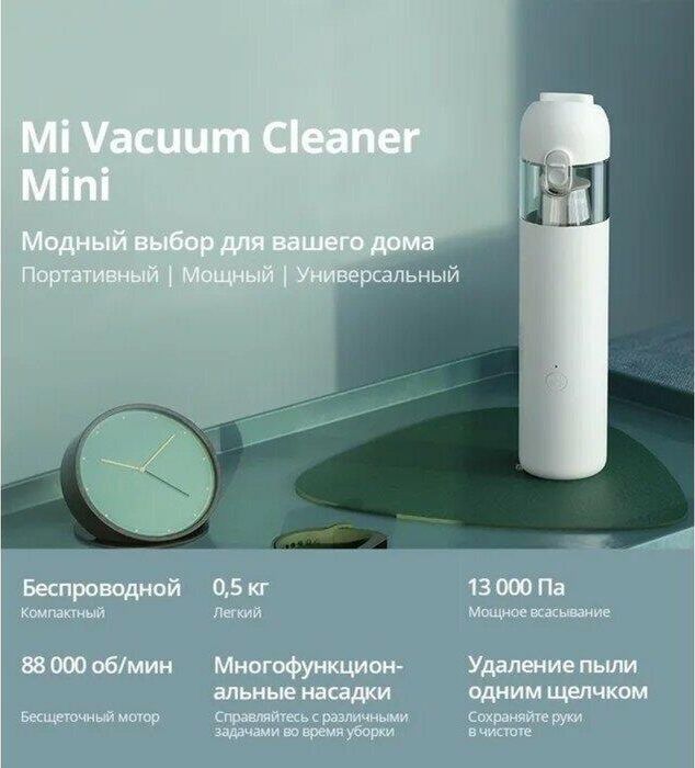 Цвет Белый Тип уборки сухая уборка Тип пылесборника контейнер Обслуживаемая площадь (кв.м.) 5 Емкость пылесборника (мл) 100 Мощность (Вт) 40 Максимальный уровень шума (дБ) 65 Управление со смартфона Нет Мощность всасывания, Па 6000 Питание Аккумулятор литий-ионный Емкость аккумулятора 2000 mA-ч Время работы (мин) 30 Время зарядки (мин) 90 Источник питания от аккумулятора Внешний вид Ширина (мм) 55 Глубина (мм) 55 Высота (мм) 267 Вес (г) 500 Материал пластик Основной блок, щелевая насадка, насадка-щетка, кабель для зарядки Type-C, адаптер, руководство по эксплуатации/