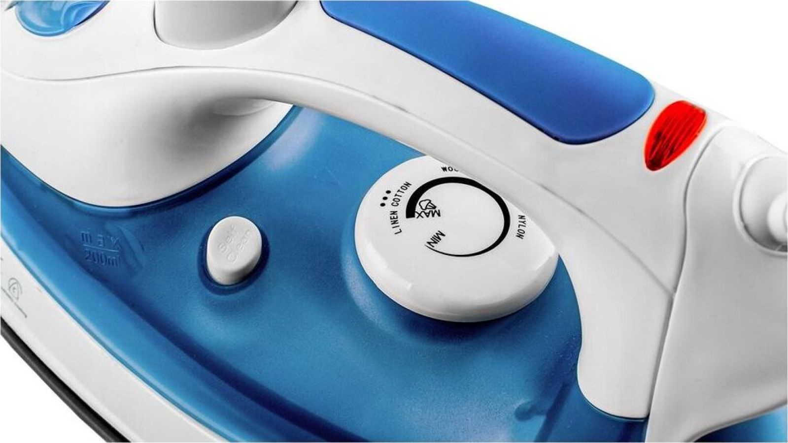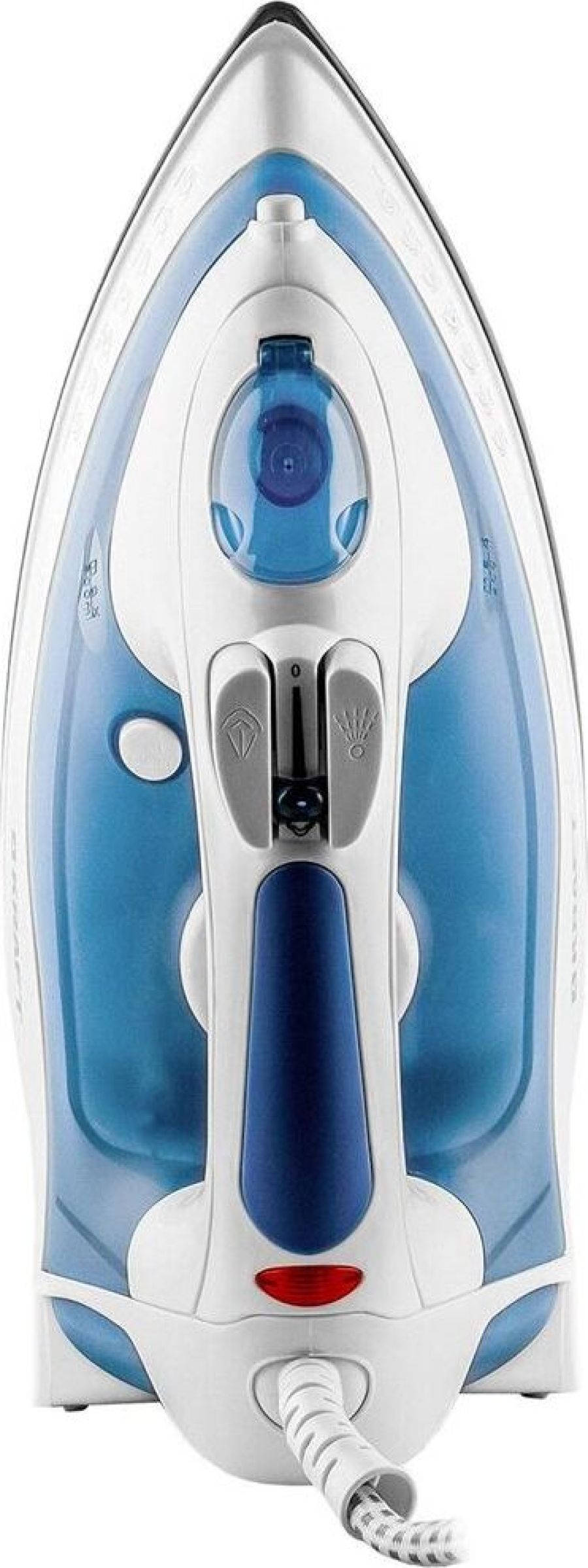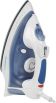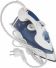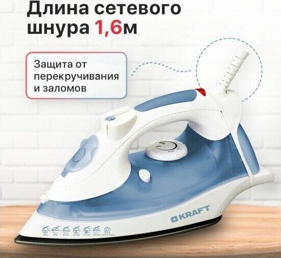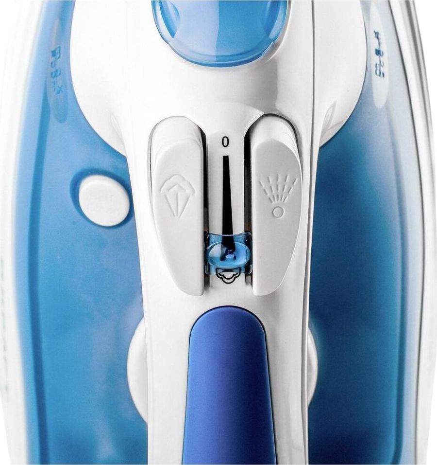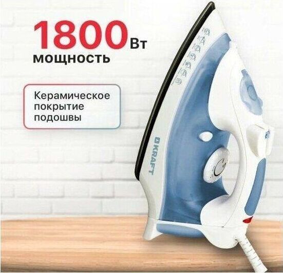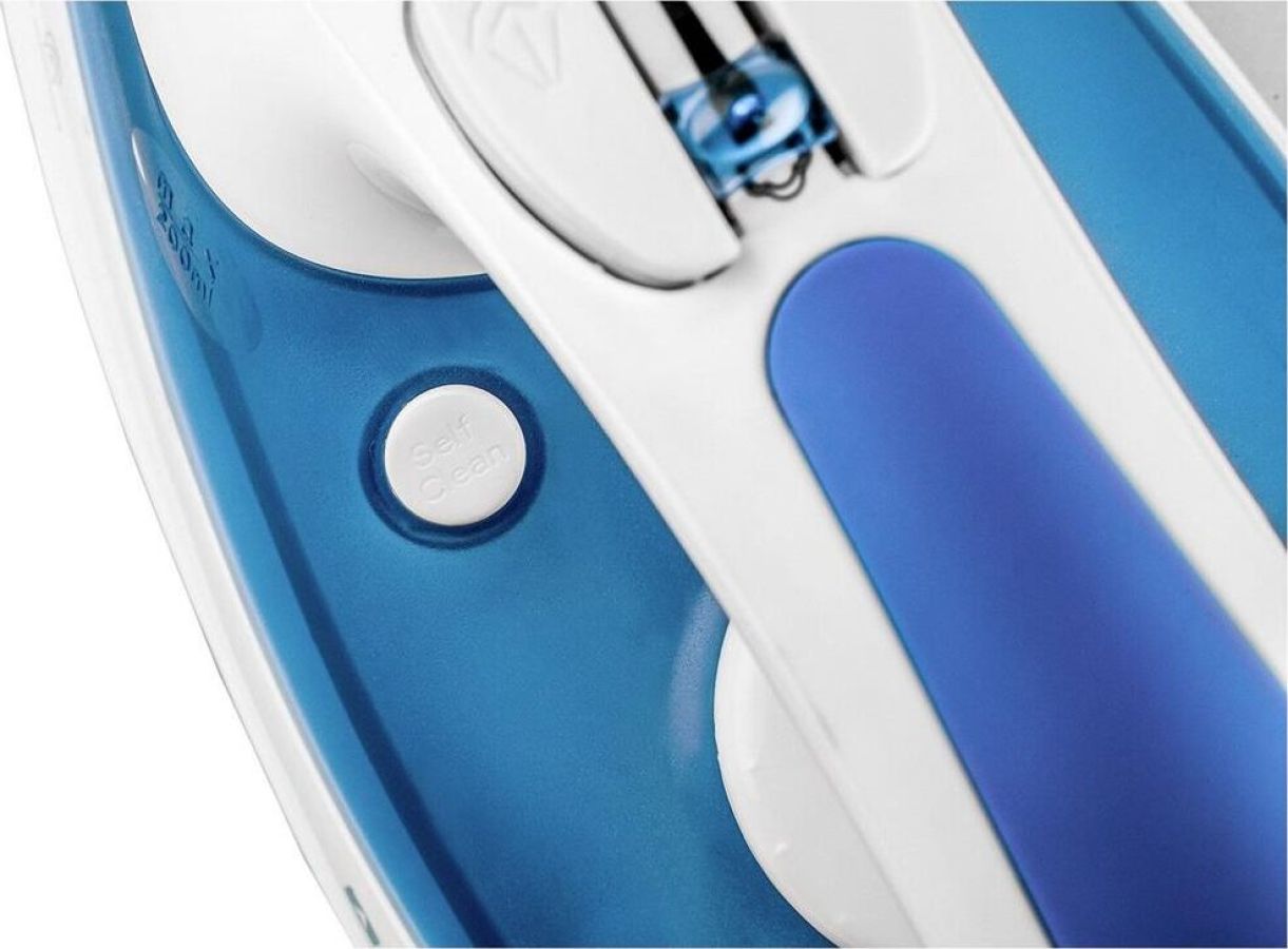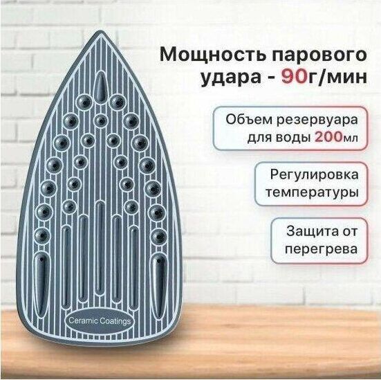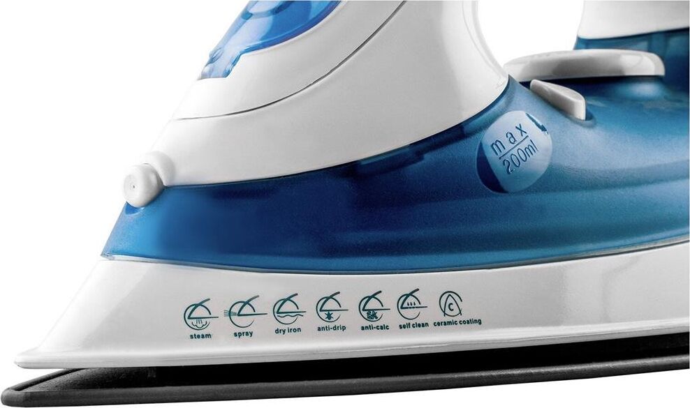 (ШхГхВ) в упаковке 31,2х12,5х15см.Подошва керамическое покрытие. Вертикальное отпаривание.Функция разбрызгивания.Система самоочистки. Ручка регулировки температуры.Длина электрического каблея (м)1,6.Паровой удар Мощность парового удара (г/мин) 0,3-0,5.Объем резервуара для воды (мл) 200. Мощность (Вт) 1800.Цвет белый / синий.