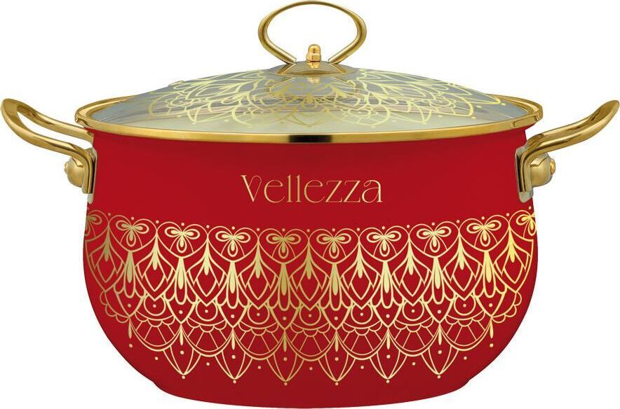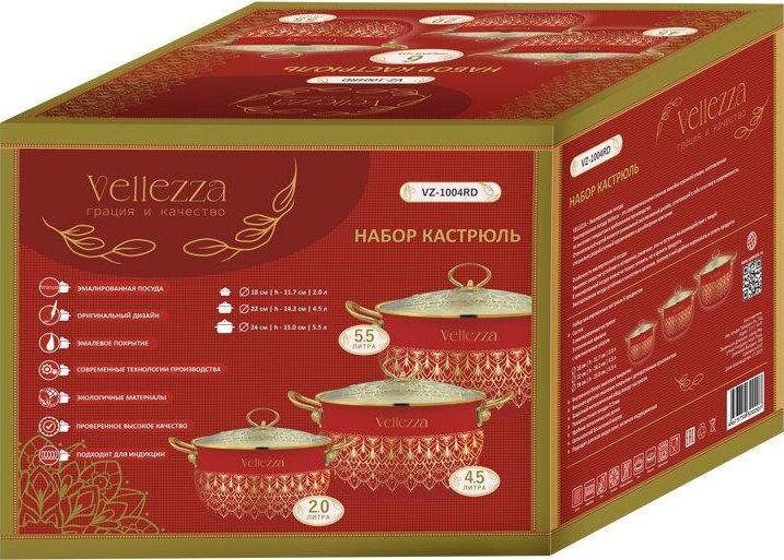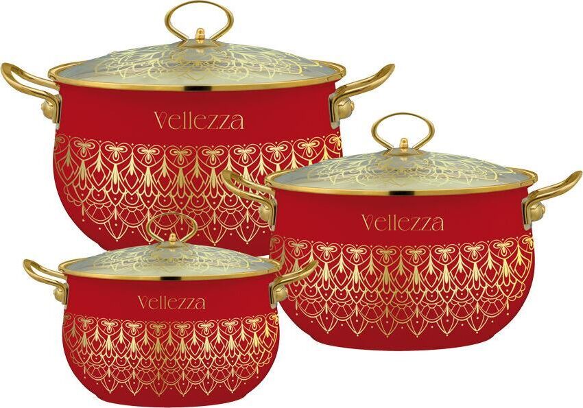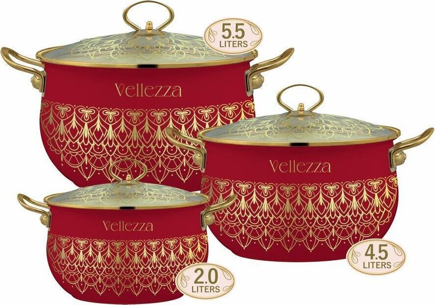 Набор кастрюль VELLEZZA RED 6 предметов: 3 эмалированные кастрюли 3 стеклянные крышки Размеры: Ø 18 | h-11.7 см | 2.0 л Ø 22 | h-14.2 см | 4.5 л Ø 24 | h-15.0 см | 5.5 л Ø 28 | h-16.5 см | 8.5 л Внутреннее белое эмалевое покрытие Внешнее цветное эмалевое покрытие с декоративным орнаментом Защитный металлический обод вокруг кастрюли Толщина стенок посуды 0.9 мм Ручки из нержавеющей стали Цельнолитой бесшовный корпус Подходит для всех видов плит, включая индукционные