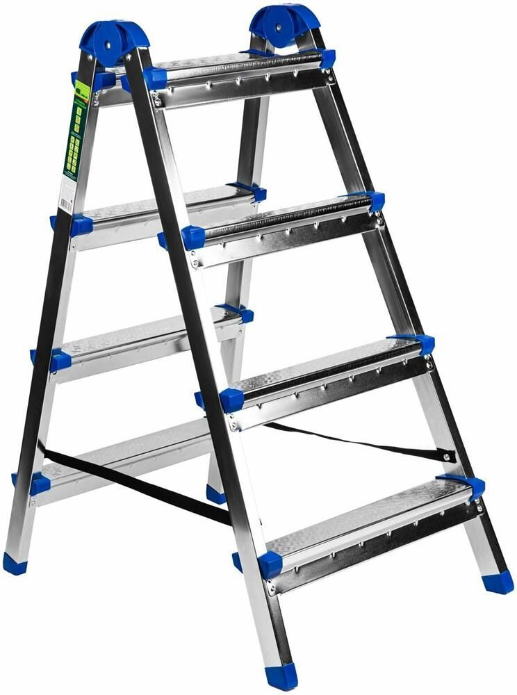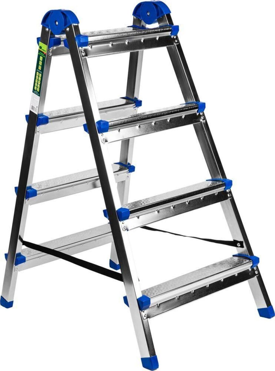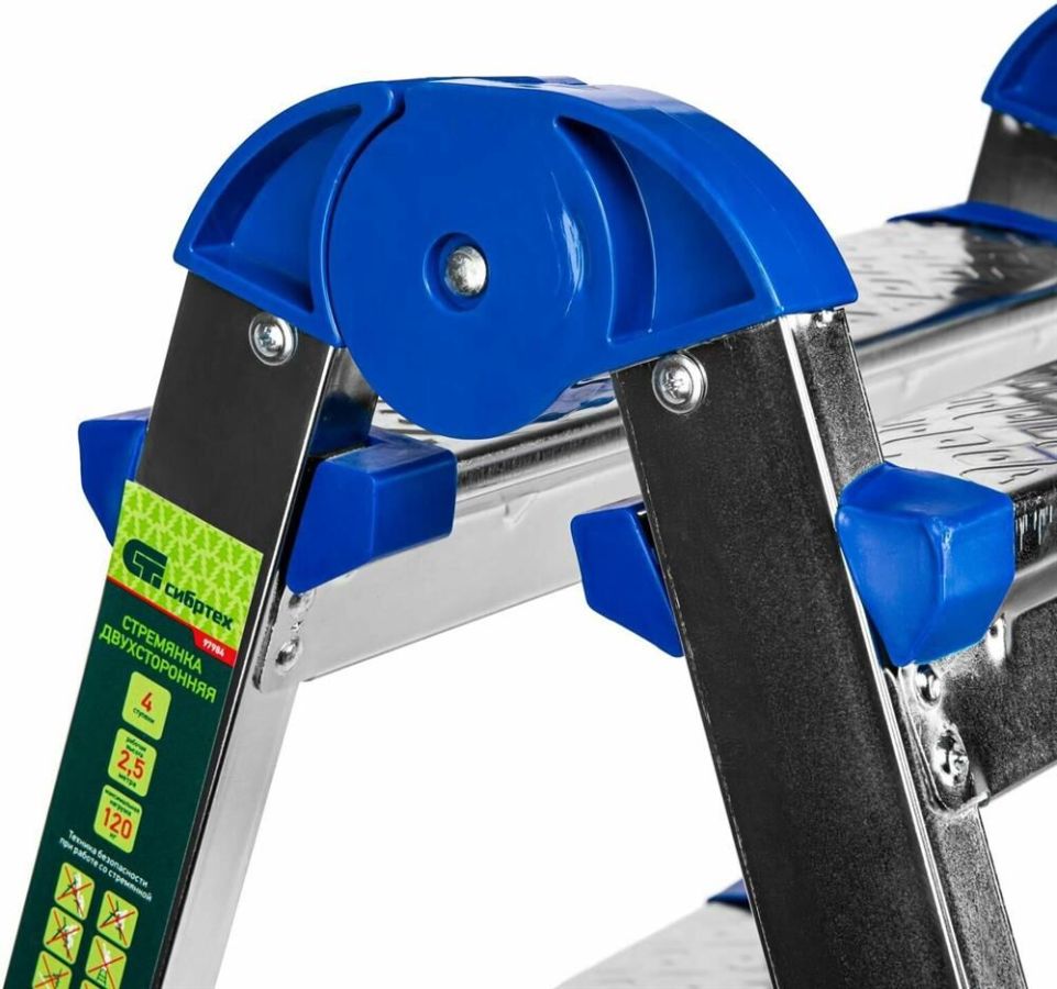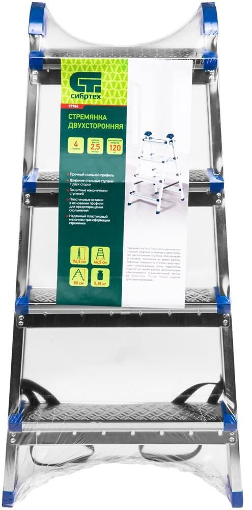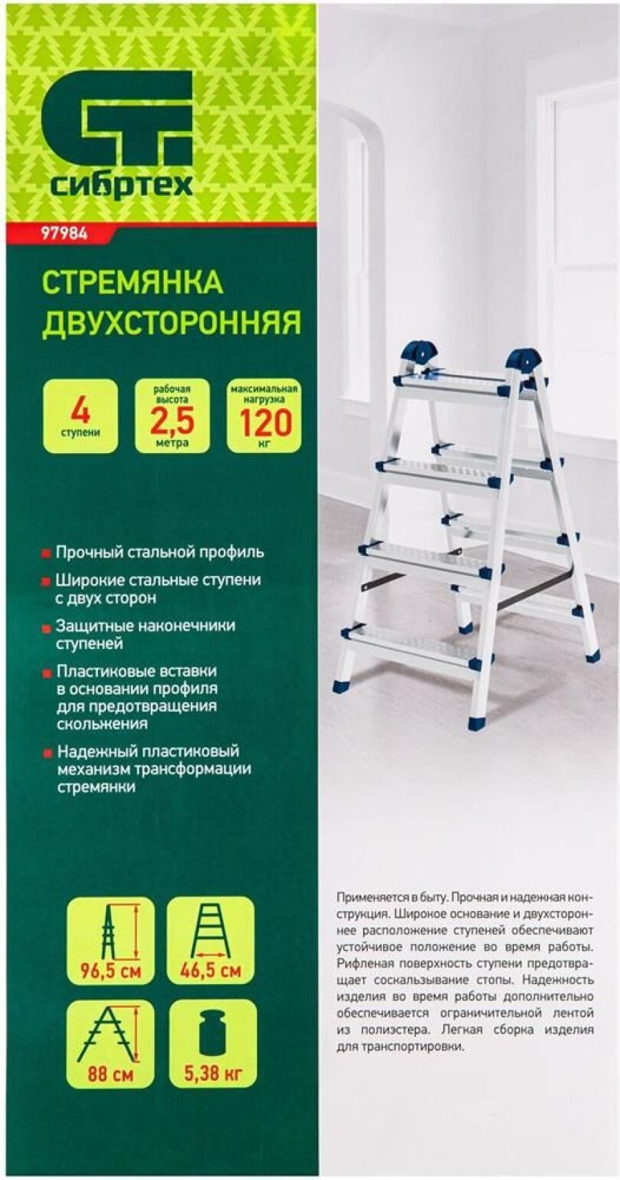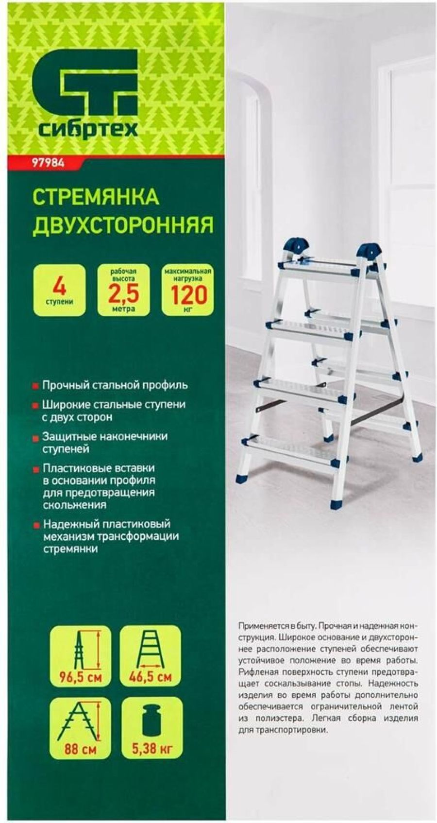 Стремянка двухсторонняя Сибртех 97984 со стальным профилем и 4 стальными ступенями помогает решать бытовые задачи на высоте, превышающей человеческий рост. Ее используют, чтобы доставать предметы с антресолей или шкафов, проводить уборку, менять лампочки, вешать полки или картины. Работать с электроинструментом на ней не рекомендуется. Стремянка с пластиковым складным механизмом повышенной стабильности и широким основанием очень устойчива на ровной поверхности. Площадка находится на высоте 88 см от опорной поверхности, рабочая высота стремянки составляет 288 см (при среднем росте пользователя 170 см).ПреимуществаНадежность — стремянка из стального профиля с широкими ступенями выдерживает вес до 120 кг, страховочные ленты из полиэстера повышают устойчивость.Безопасность пользователя — на рифленых широких ступенях ступни не скользят, на углах имеются пластиковые наконечники для защиты от травм.Защита напольного покрытия — благодаря специальным вставкам ножки не скользят и не оставляют царапин.Удобная транспортировка — стремянка весом 5,5 кг легко складывается, ее размеры в сложенном состоянии 965 х 465 х 160 мм.