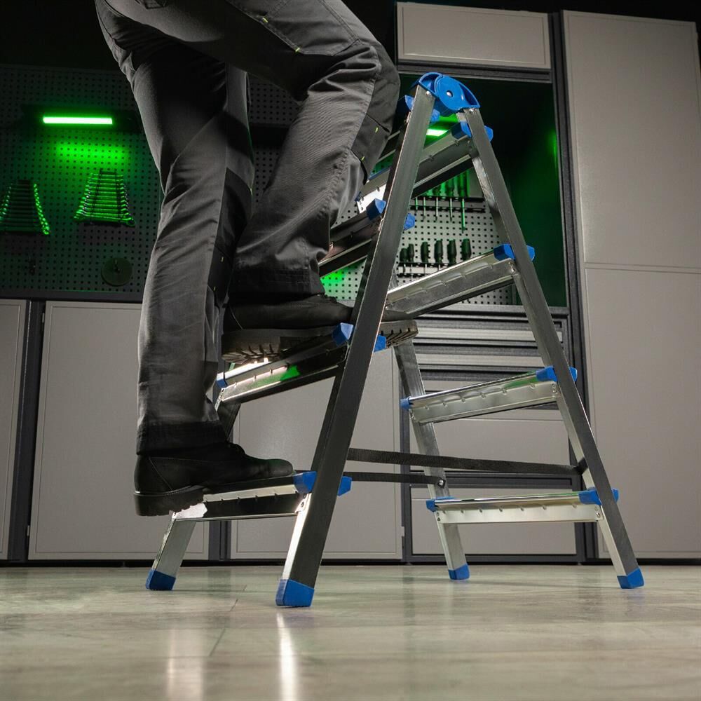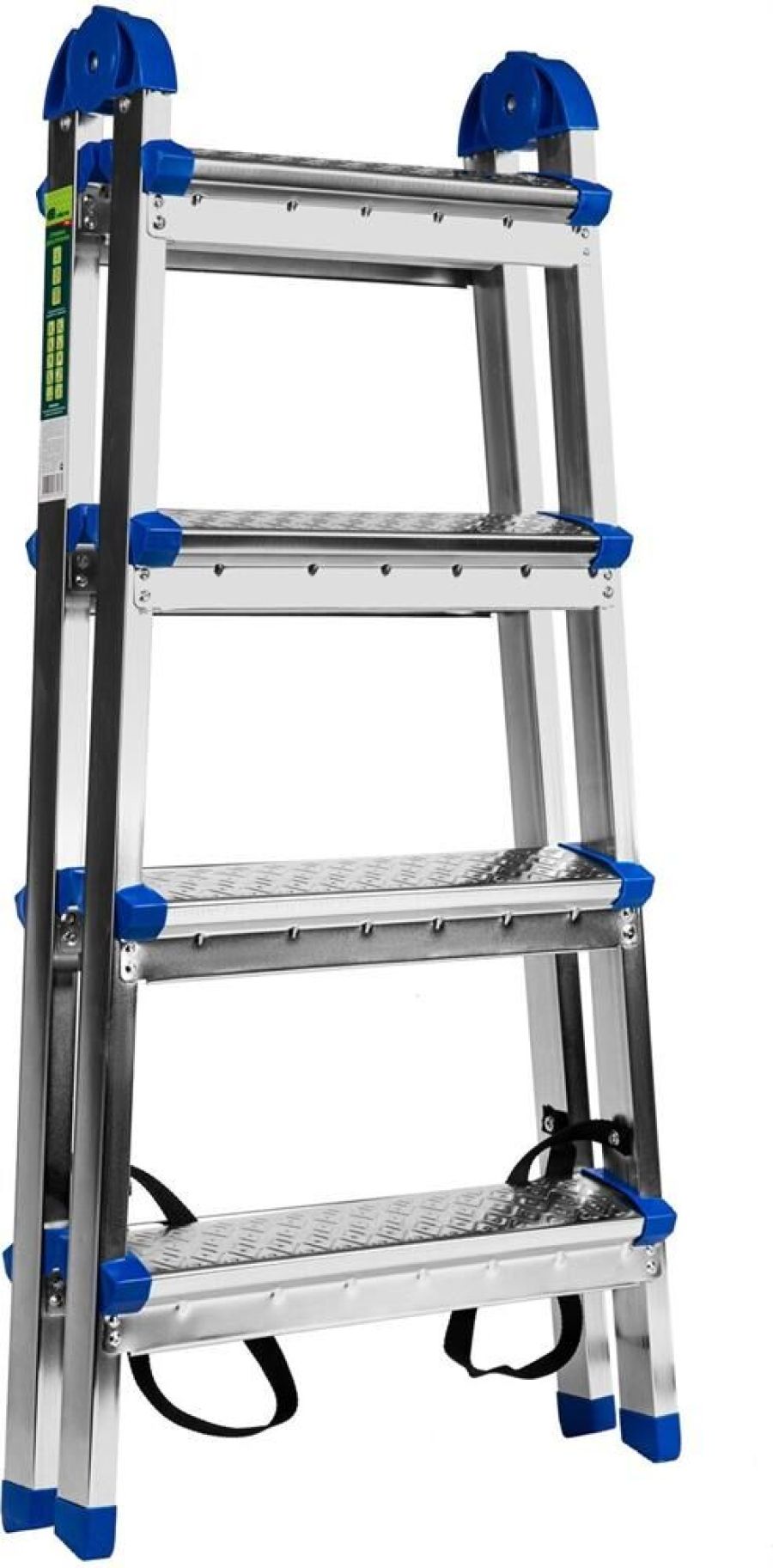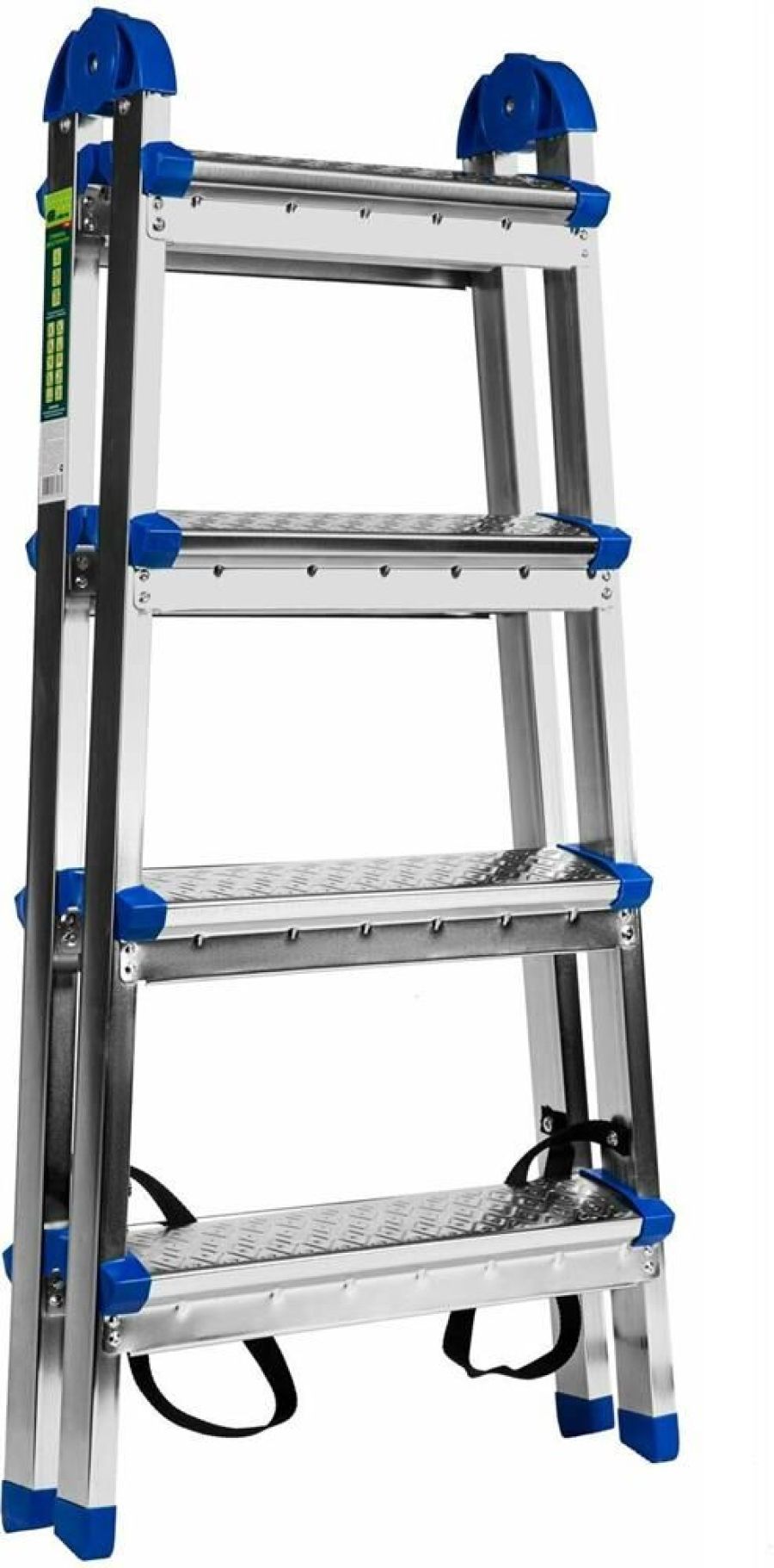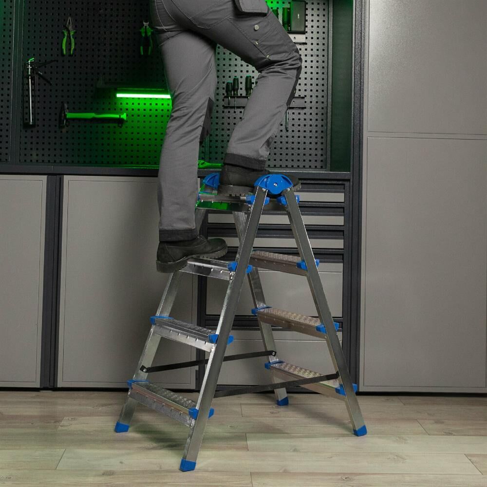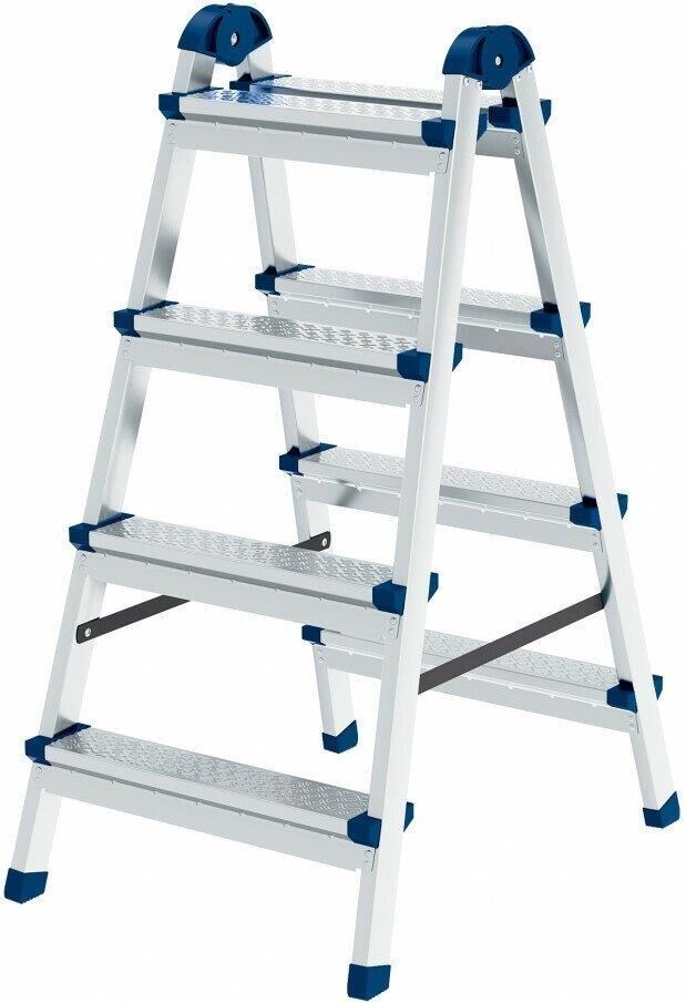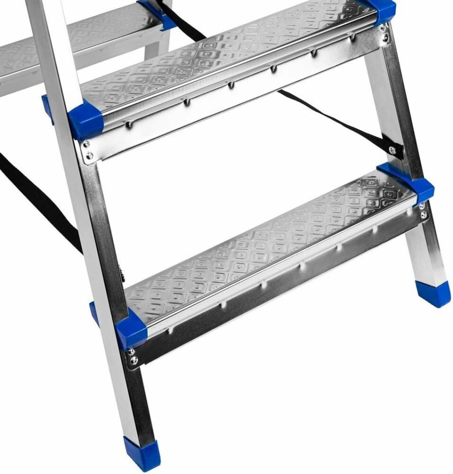 Стремянка двухсторонняя Сибртех 97984 со стальным профилем и 4 стальными ступенями помогает решать бытовые задачи на высоте, превышающей человеческий рост. Ее используют, чтобы доставать предметы с антресолей или шкафов, проводить уборку, менять лампочки, вешать полки или картины. Работать с электроинструментом на ней не рекомендуется. Стремянка с пластиковым складным механизмом повышенной стабильности и широким основанием очень устойчива на ровной поверхности. Площадка находится на высоте 88 см от опорной поверхности, рабочая высота стремянки составляет 288 см (при среднем росте пользователя 170 см).ПреимуществаНадежность — стремянка из стального профиля с широкими ступенями выдерживает вес до 120 кг, страховочные ленты из полиэстера повышают устойчивость.Безопасность пользователя — на рифленых широких ступенях ступни не скользят, на углах имеются пластиковые наконечники для защиты от травм.Защита напольного покрытия — благодаря специальным вставкам ножки не скользят и не оставляют царапин.Удобная транспортировка — стремянка весом 5,5 кг легко складывается, ее размеры в сложенном состоянии 965 х 465 х 160 мм.