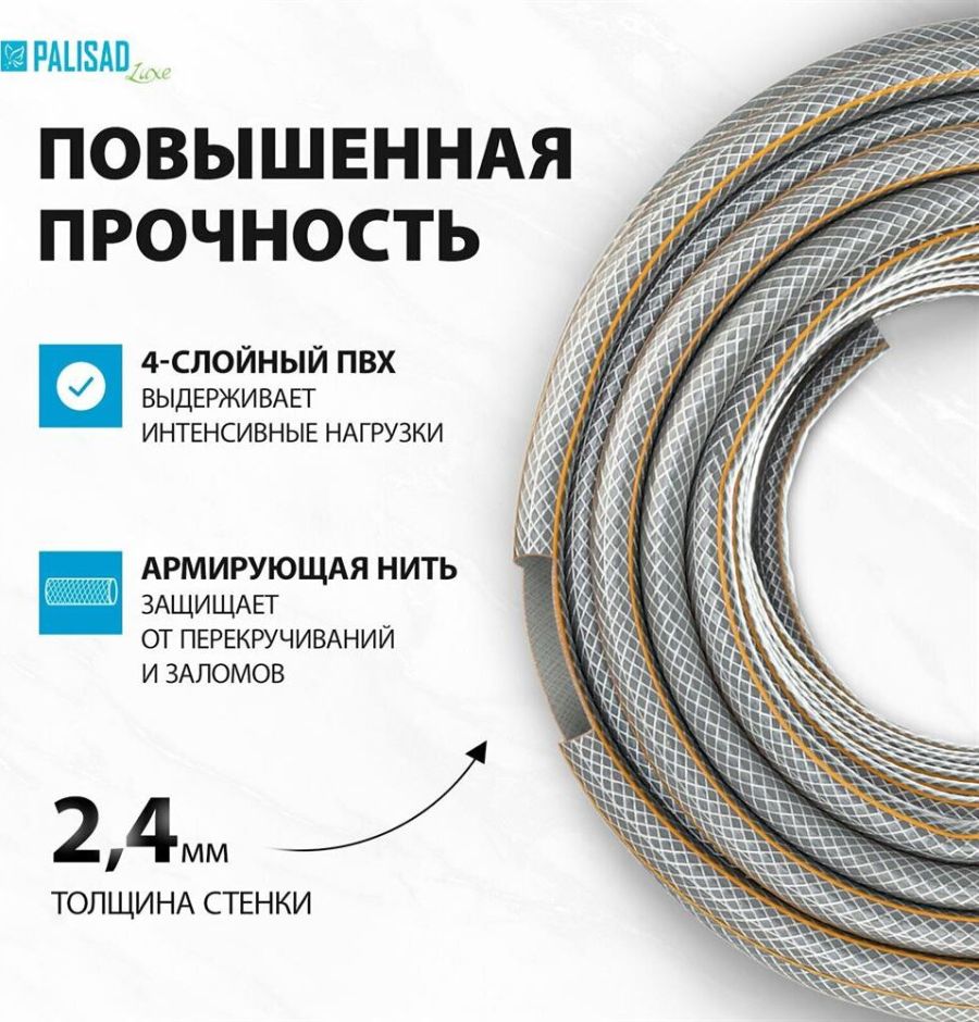 PALISAD Шланг поливочный 4-слойн. армированный "PROFESSIONAL", 3/4" 25 метров Предназначен для орошения почвы на садовых и парковых участках. Изготовлен из ПВХ высокого качества. Материал армирующего слоя - полиэстерная нить. Имеет высокую прочность, гибкость и устойчивость к перепадам температур. Устойчив к ультрафиолетовым лучам. Рассчитан на эксплуатацию в условиях интенсивных нагрузок. Максимальная нагрузка - 25 бар. Диапазон рабочих температур от –20 до +60 °С. Не содержит вредные для окружающей среды вещества. Совместим со всеми элементами системы полива PALISAD и PALISAD Luxe.